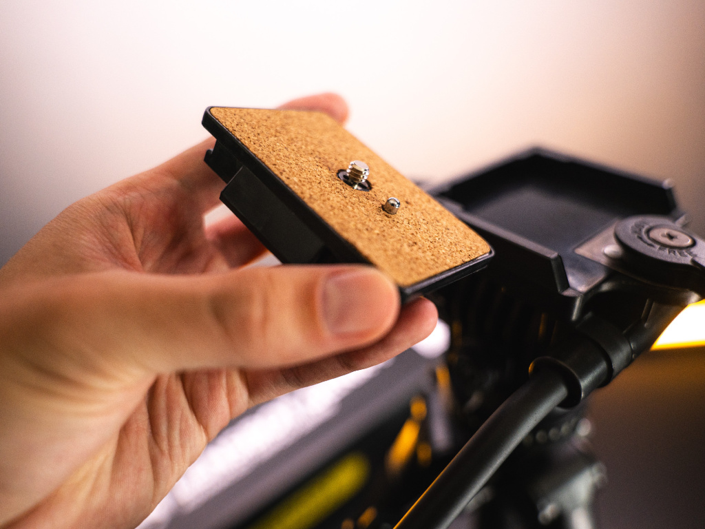 Rychloupínací destička je oproti obdobným stativům v dané cenové relaci o něco pevnější. Spodní strana destičky má pevnější, ostřejší úhly a rozměrově je výrazně větší než u jiných výrobců. Jedná se sice o tvrzený polyamide, ale uváděná nosnost 4 kg by opravdu měla bezproblému sedět i při tvrdším zacházení.