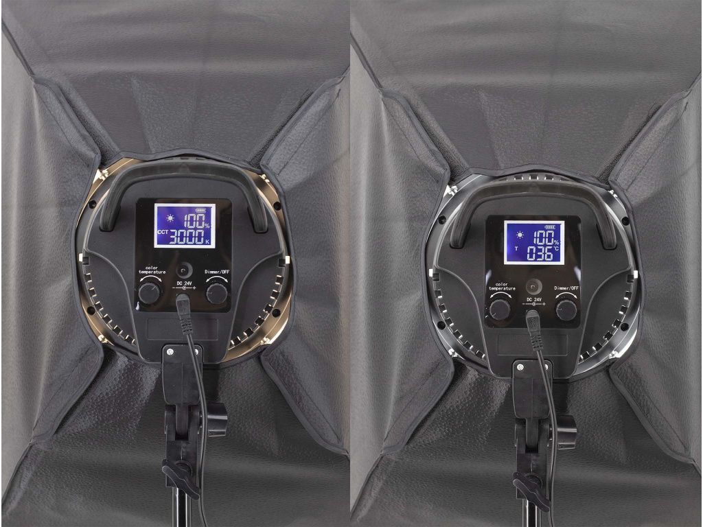 | Regulace intenzity i teploty světla Softbox s možností regulace intenzity světla pomocí otočného kolečka a zároveň možnosti změny teploty z 5700K na 3000K pomocí otočného kolečka také (novinka). Výhodou tohoto setu je jednoznačně pokročilá možnost změny svítivosti. Jakmile fotíte, či natáčíte detail je potřeba menší výkon což toto světlo bez problému zajistí. U žárovkových softboxů je potřeba regulovat intenzitu světla výměnou žárovky, či posunutím softboxů, což ne vždy lze provést kvůli nedostatku místa. |