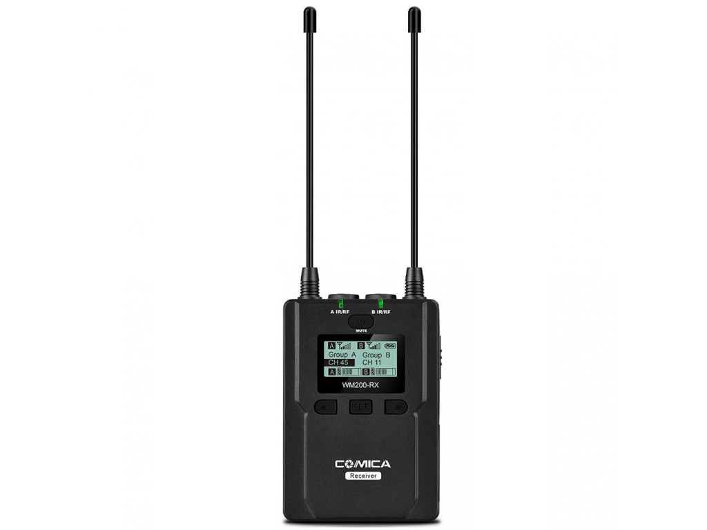 Comica Audio RX přijímač je určený pro bezdrátovou sadu CVM-WM200 A/B/C/D. Přijímač slouží jako základ pro vytvoření funkční sady mikroportů. Pro správnou funkčnost sady budete potřebovat jeden nebo dva TX vysílače, nebo jeden vysílač lze nahradit ručním mikrofonem HTX.