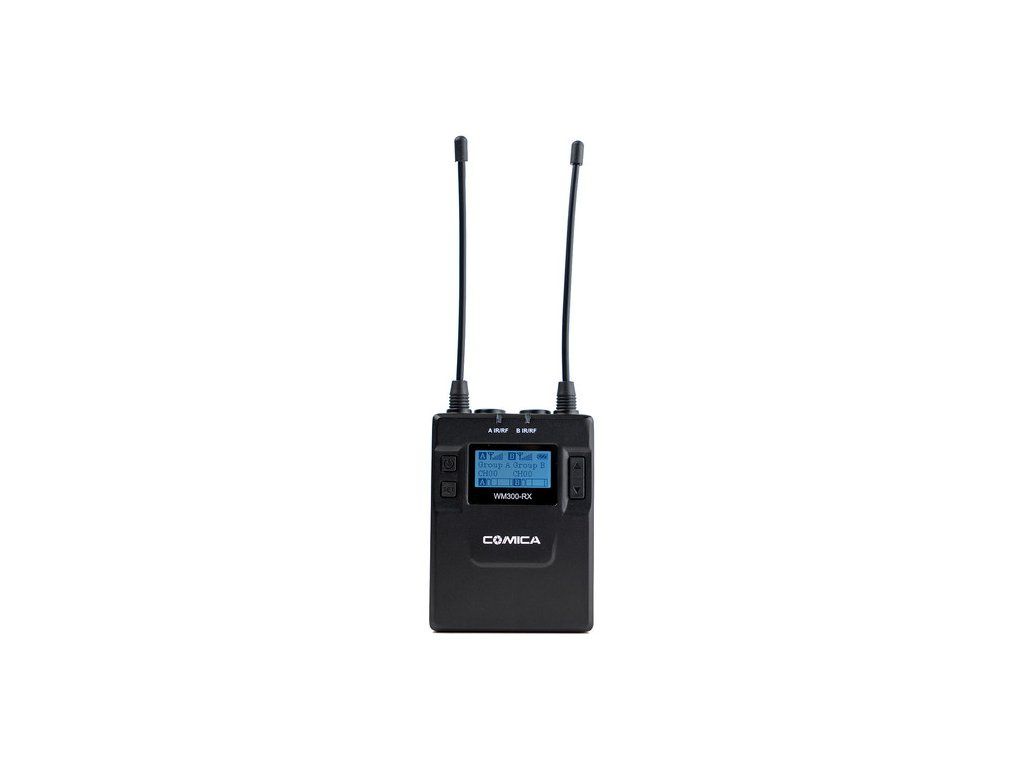 Comica Audio RX přijímač je určený pro bezdrátovou sadu CVM-WM300 A/B/C/D. Přijímač slouží jako základ pro vytvoření funkční sady mikroportů. Pro správnou funkčnost sady budete potřebovat jeden nebo dva TX vysílače, nebo jeden vysílač lze nahradit ručním mikrofonem HTX.