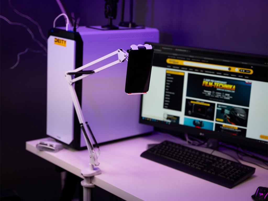 Hliníkový otočný držák pro telefony a tablety v rozměrech od 13 do 23 cm. Slouží jako stativ na stůl pro streamování, focení, sociální sítě.