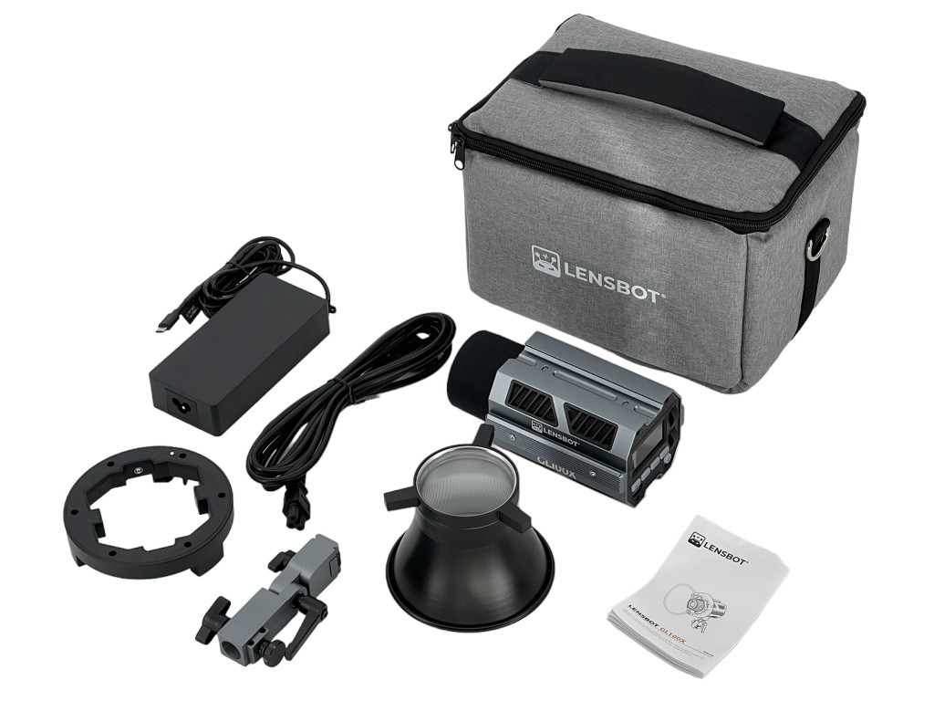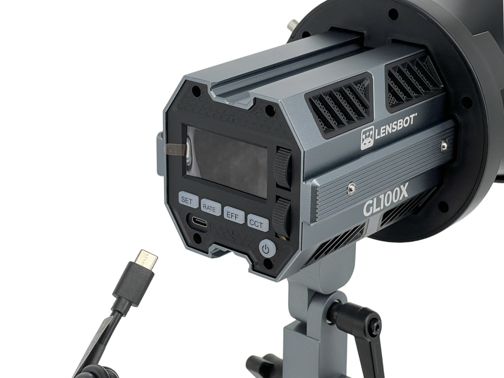Ke světlu je dodávaný USB-C adaptér. Světlo by teoreticky šlo napájet z powerbanky, museli byste však splnit napětí 24V5A. Součástí balení je i adaptér pro vytvoření Bowens Mountu. LENSBOT GL100X lze velice jednoduše ovládat pomocí rozhraní na zadní straně světla. Díky LCD displeji uvidíte aktuálně nastavené hodnoty. Světlo obsahuje řadu speciálních efektů. Aby se práce se světlem maximálně urychlila, můžete si stáhnout Smartphone aplikaci.