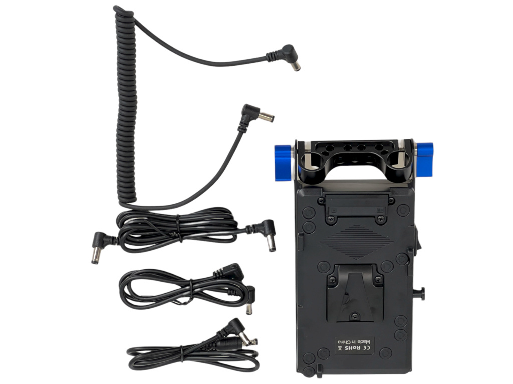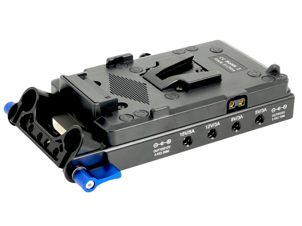 Kvalitní V-mount rozvaděč napájení obsahuje ihned několik možností výstupu. Vstup je jasný = baterie V-mount. Z fotek může rozvaděč působit "plastově", ale mimo V-mount slot se jedná o pevný hliník, opravdu dobře zpracovaný, solidní rozvaděč. Rozvaděč pro nás dodává firma vyrábějící značkové V-mount baterie.