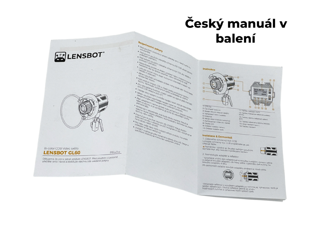 Ke světlu je dodávaný USB-C adaptér. Světlo by teoreticky šlo napájet z powerbanky, museli byste však splnit napětí 24V5A. Součástí balení je i adaptér pro vytvoření Bowens Mountu. LENSBOT GL60 lze velice jednoduše ovládat pomocí rozhraní na zadní straně světla. Díky LCD displeji uvidíte aktuálně nastavené hodnoty. Světlo obsahuje řadu speciálních efektů. Aby se práce se světlem maximálně urychlila, můžete si stáhnout Smartphone aplikaci.