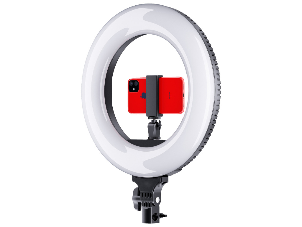 14" kruhové světlo, ring light s nastavitelnou teplotou mezi 3000-6500K. Možnost nastavení intenzity světla mezi 10-100%. Součástí balení 3 držáky pro smartphone.