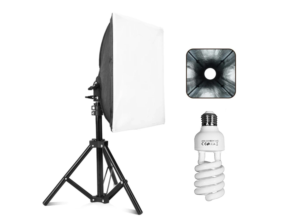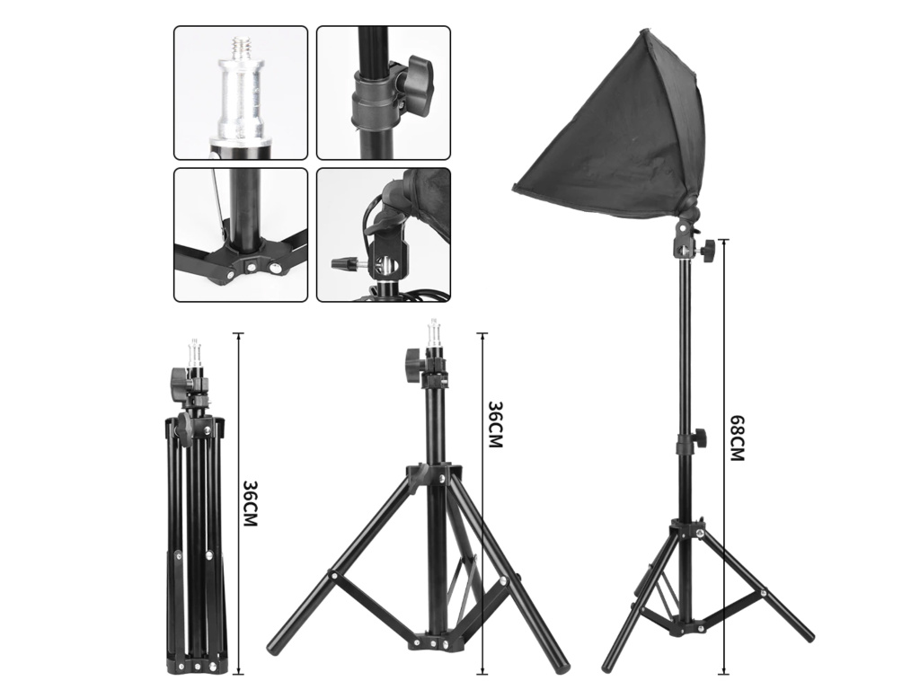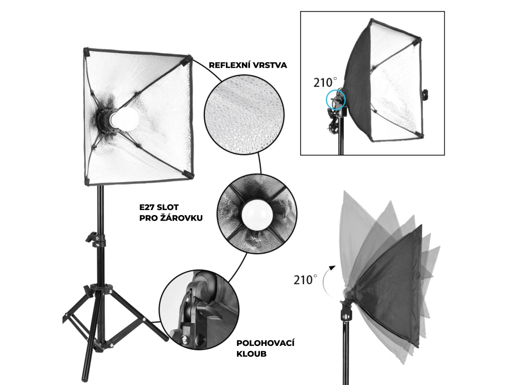 Mini softbox včetně malého teleskopického stativu (výška 32 až 45 cm). Součástí balení je 1× žárovka o výkonu 45 W, umožňující změnu teploty dle potřeby. Žárovka má teplotu 6400K. Jak samotný softbox svítí a jak je zabalen, si můžete prohlédnout ve videu níže.