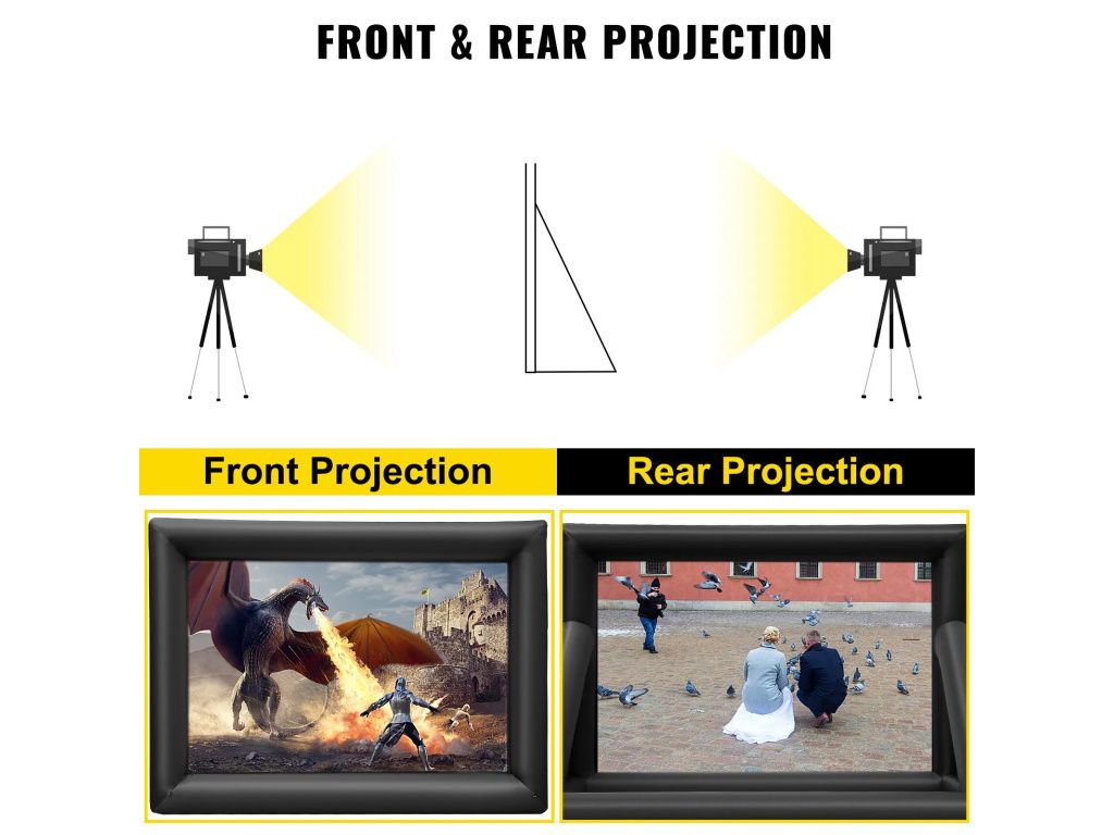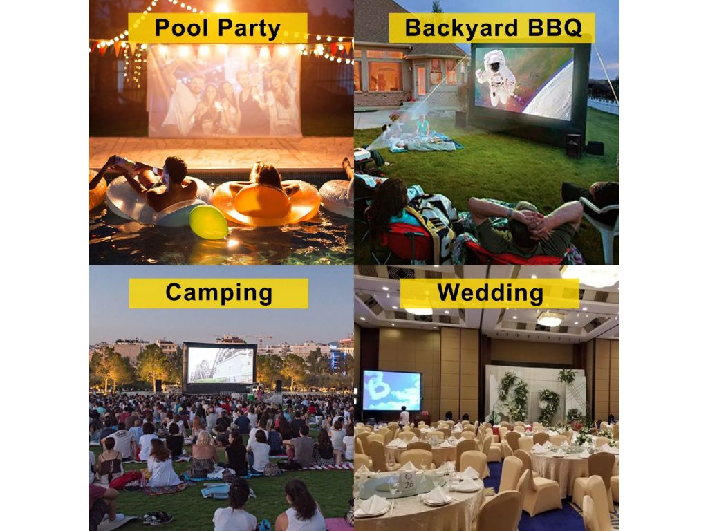 Nafukovací projekční plátno nabízí velkou zobrazovací plochu 4 × 2,1 m s poměrem stran 16:9. Podporuje přední i zadní projekci, takže si můžete vychutnat kvalitní filmový zážitek doma i venku s rodinou a přáteli.