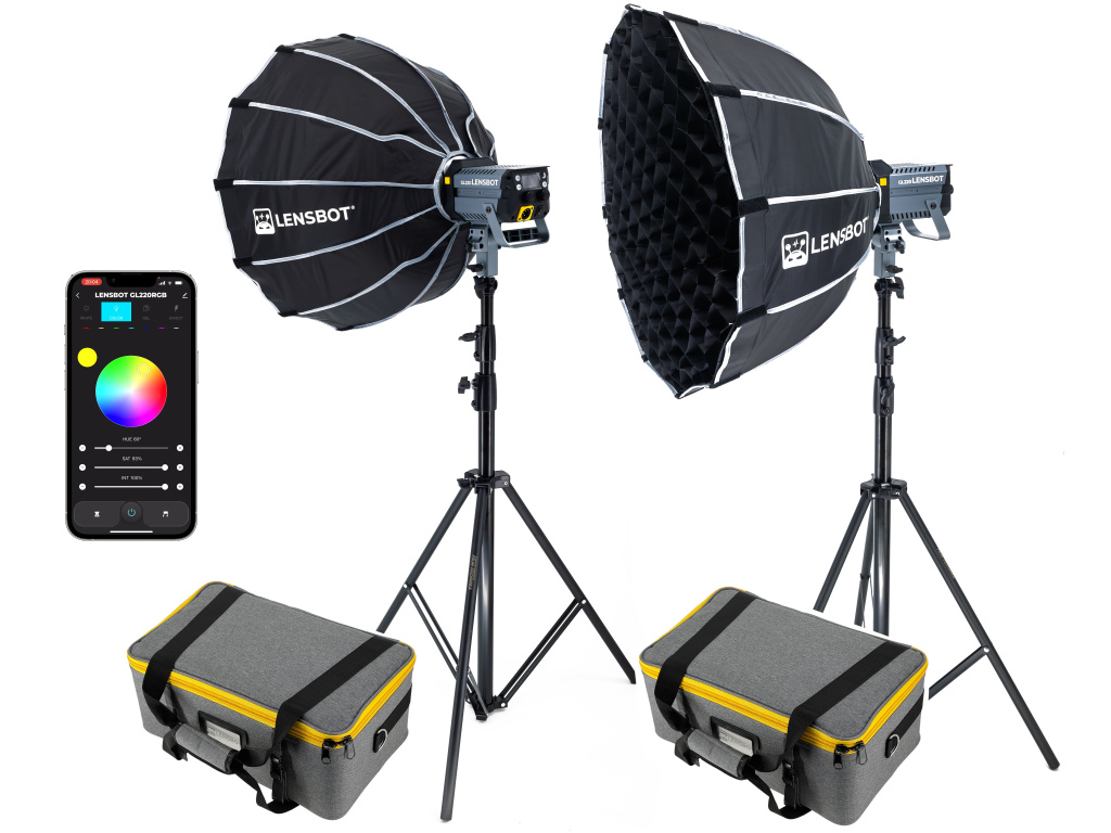 Set COB světel 2 x LENSBOT GL220 (2 x stativ, 2 x softbox) 220W, 105000 luxů na 1 metr, Bi-Color, Smartphone app