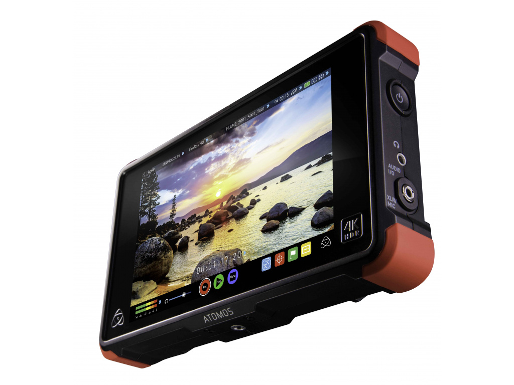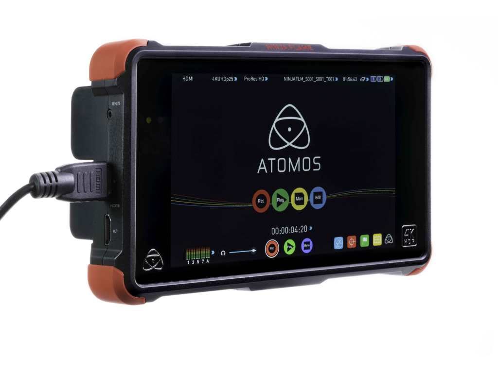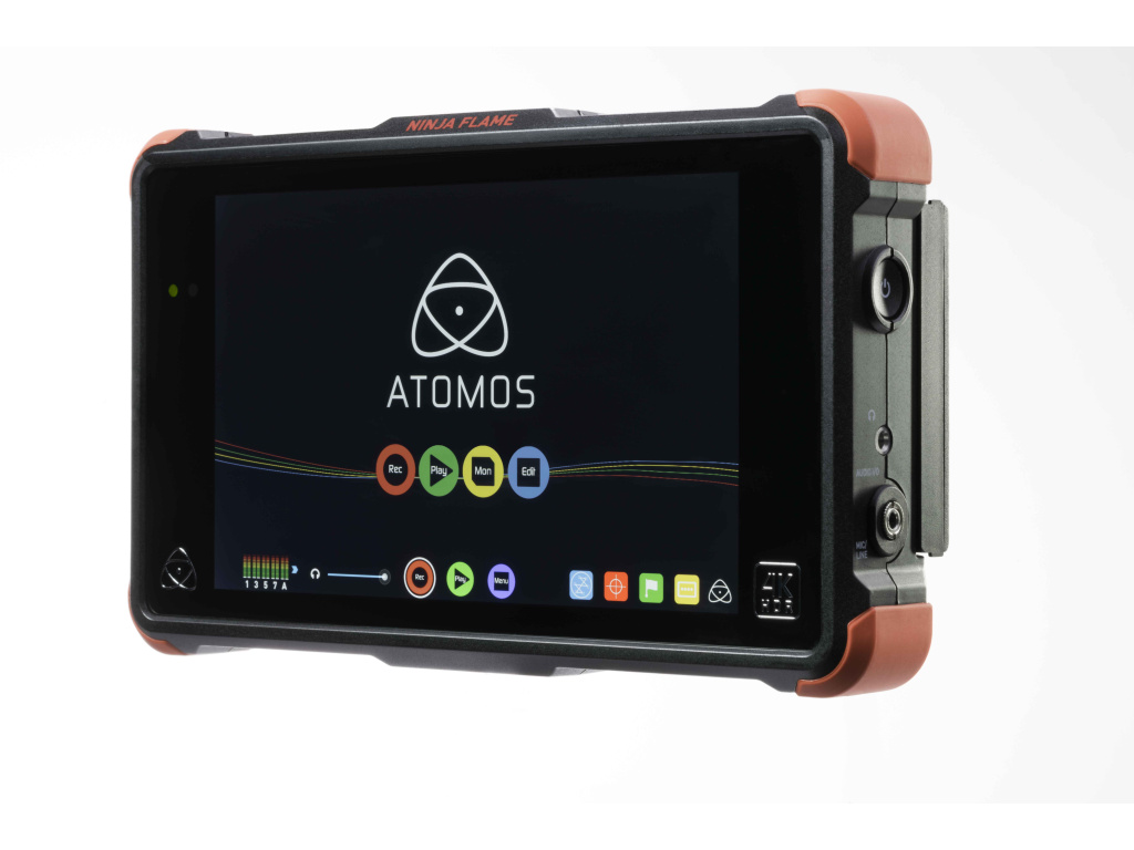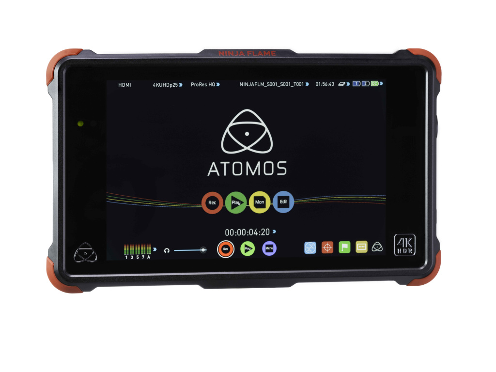 Der Atomos Ninja Flame ist ein 7-Zoll-Monitor mit einer Auflösung von 1920 x 1200 Pixeln, der eine Kombination aus einem 4K-Recorder und einem 10-Bit-FRC-Panel (Display) darstellt, das sowohl die native HDR-Anzeige (Log) von Filmmaterial als auch die qualitativ hochwertige Anzeige von Rec.709-Material mit Hintergrundbeleuchtung (Helligkeit) unterstützt. Atomos-Recorder verwenden in der Regel die HDMI-Übertragungsfunktion. Einige Modelle verfügen auch über einen SDI-Anschluss (siehe.Shogun Inferno). Der HDMI-Ausgang ermöglicht die Übertragung von UHD 4K-Material, das Ninja Flame auf 2,5"-SSDs im 4:2:2 Apple ProRes-Codec und Avid DNxHR-Codec aufzeichnet.