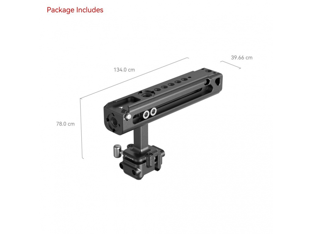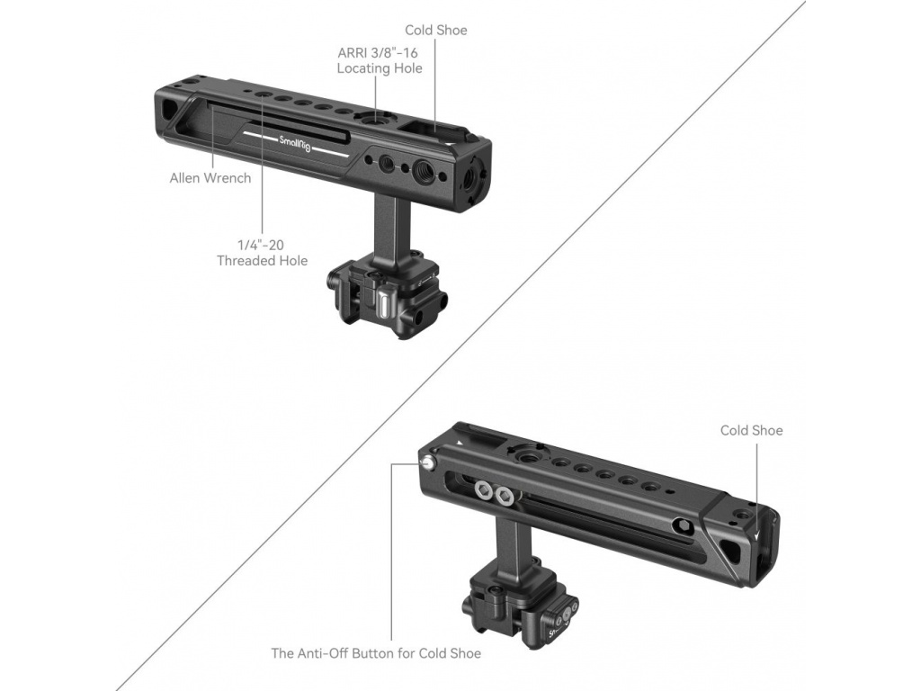 Der SmallRig Snap-on Quick Lock NATO Top Handle 4175 wurde entwickelt, um die Kamerabewegung zu unterstützen, Aufnahmen aus niedrigen Winkeln zu stabilisieren und die Kameraausrüstung mit sich zu führen, während er eine Vielzahl von Zubehörhalterungen bietet. Kompatibel mit der Standard-NATO-Schiene, der Griff klickt oder löst die NATO-Schiene in einer Sekunde, ohne vorher anderes Zubehör zu entfernen, spart Zeit beim Schießen. Sie kann mit einem Schraubenschlüssel weiter angezogen werden. Der 134 mm lange Griff lässt auch nach der Installation von Zubehör noch viel Platz zum Greifen; die 80 mm lange Einstellung von vorne nach hinten sorgt für einen ausgewogenen Griffpunkt für Ihre Kamera. Zum Lieferumfang gehören auch Zubehörhalterungen wie 1/4"-20-Gewinde, 1/4"-20-Axialbohrung, ARRI 3/8"-16-Axialbohrung, LED-Kaltlichthalter, Mikrofon, usw. Außerdem ist ein integrierter magnetischer Inbusschlüssel enthalten, der das Anbringen und Lösen von Zubehör erleichtert.