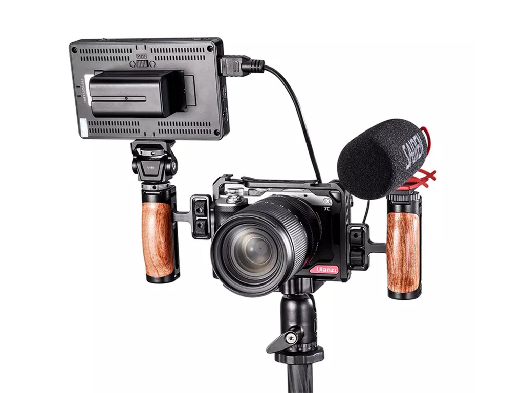 Hochwertiger Holzgriff für Kamerakäfige von Ulanzi. Er wird mit zwei 1/4"-Schrauben (im Lieferumfang des Griffs enthalten) befestigt und kann mit den Käfigen aller Hersteller verwendet werden, da die Schraubenabstände den Standardabständen der Kamerakäfige entsprechen. An der Oberseite des Griffs befinden sich ein Kaltgeräteschuh und 3 x 1/4"-Innengewinde für weiteres Zubehör wie magischer Arm etc.