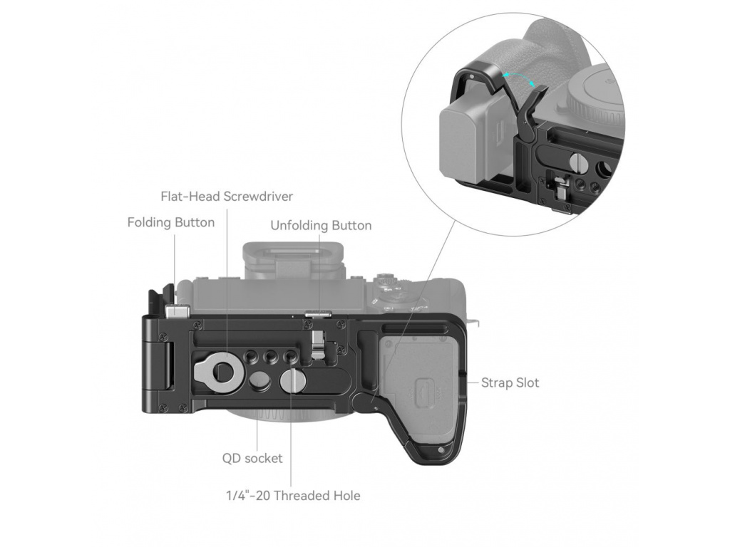 Die SmallRig faltbare L-förmige Montageplatte für Sony Alpha 7R V / Alpha 7 IV / Alpha 7S III 3984 erleichtert den schnellen Wechsel zwischen horizontalen und vertikalen Aufnahmen, wobei der Zugang zum LCD-Klappbildschirm erhalten bleibt. Die Seiten des Arca-Swiss lassen sich für horizontale Aufnahmen mit dem Faltknopf schnell auf die Unterseite klappen und als tragbares Zubehörteil verstauen. Für vertikale Aufnahmen kann die Grundplatte ausgefahren werden, um den Zugang zum Kabel zu ermöglichen. Die L-Halterung wird mit einer 1/4"-20-Schraube und Befestigungsstiften an der Unterseite an der Kamera befestigt und verfügt über Polster, die Kratzer und Verdrehungen verhindern, sowie über einen Scharnierarm am Batteriefachdeckel, der sich an die Krümmung der Kamera anpasst und das Griffgefühl verbessert. Die Grundplatte verfügt über mehrere 1/4"-20-Gewindebohrungen für den Magic Arm 3873 und den Cold Shoe 2935 für Monitor, Mikrofon und anderes Zubehör in der Videoproduktion, eine Handgelenkgurtbohrung und einen QD-Anschluss für die schnelle Befestigung des QD-Schultergurts und der Handgelenkschlaufe sowie einen Schlitzschraubendreher für die Montage oder Demontage.