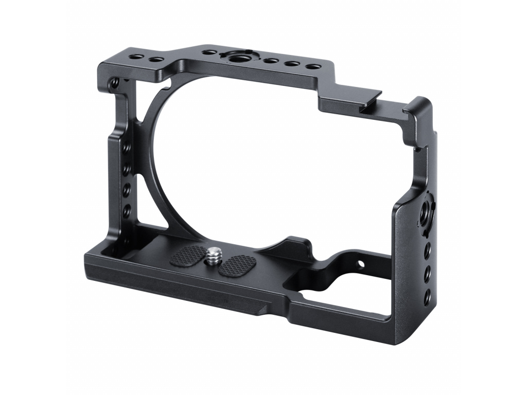 Speziell angefertigter Kamerakäfig für Sony A6400. Die sehr solide Konstruktion wiegt nur 150,5 g und bietet zusätzlichen Schutz für die Kamera. Befestigen Sie die Kamera mit der mitgelieferten 1/4"-Schraube am Käfig. Für Außenanschlüsse finden Sie eine Reihe von 1/4" - und 3/8"-Gewinden, ARRI-Aufnahmegewinden und Schlitten. Der untere Teil enthält 1/4"- und 3/8"-Gewinde für die Montage auf einem Stativ oder Stativkopf. Der Käfig bietet vollen Zugriff auf alle Kamerafunktionen, das Blitzlichtgerät und alle Anschlüsse.