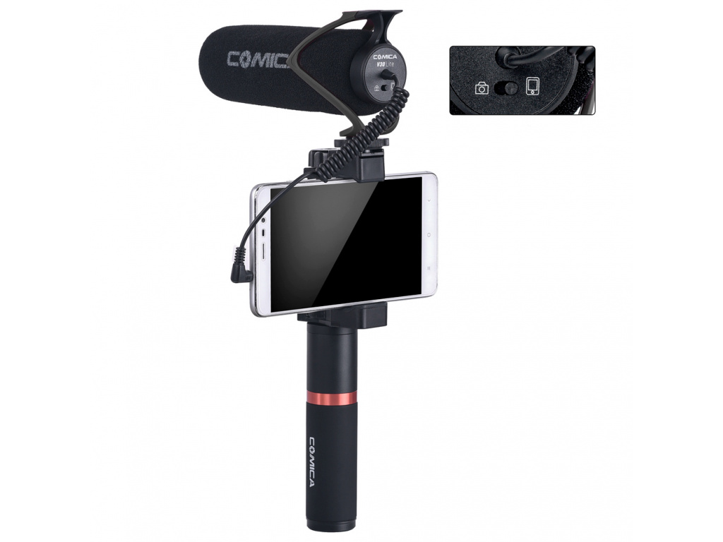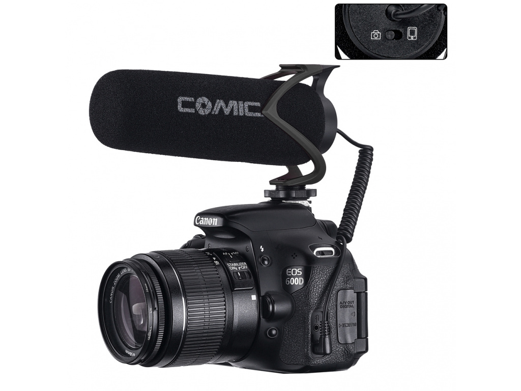Das Mikrofon ist ideal für die Verwendung mit Smartphones und Kameras. Das Mikrofon hat eine eingebaute TRRS-Buchse, die über eine Taste auf klassisches TRS (für Kameras) oder TRRS (Smartphones) umgeschaltet werden kann. Man braucht nicht einmal Batterien, was großartig ist. Der Klang ist gar nicht so schlecht (siehe Speedtest unten). Wenn Sie Ihr Handy mit einem Mikrofon ausstatten möchten, empfehlen wir Ihnen, den Abschnitt "Smartphone-Halterungen"dort finden Sie einen Käfig, in den Sie das Telefon legen und das Mikrofon befestigen.