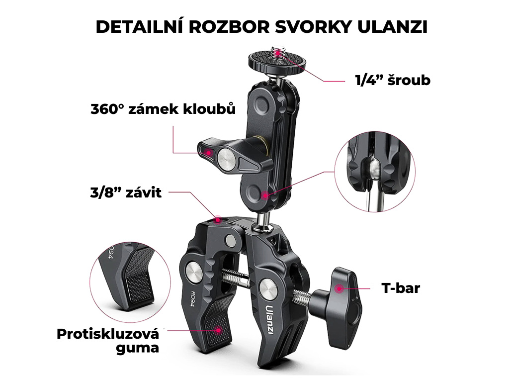 Svorka s 360° hlavou s nosností 1,5 kg, určená pro montáž externího příslušenství jako: lehčí kamery a fotoaparáty, sportovní kamery, mikrofony, apd. na příslušenství tyčového tvaru(max. průměr 60 mm). Konstrukce obsahuje nastavitelnou svorku a 360° hlavu s 1/4" šroubem a pohodlným zámkem. Ideální pro montáž sportovních kamer jako: Gopro HERO 3/3+/4/5/6/7, sj4000/5000/6000 Video a mnoho dalších kamer s podobnými rozměry.