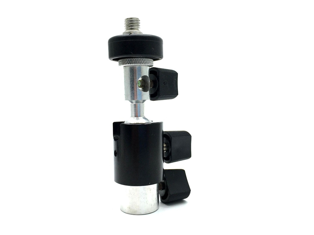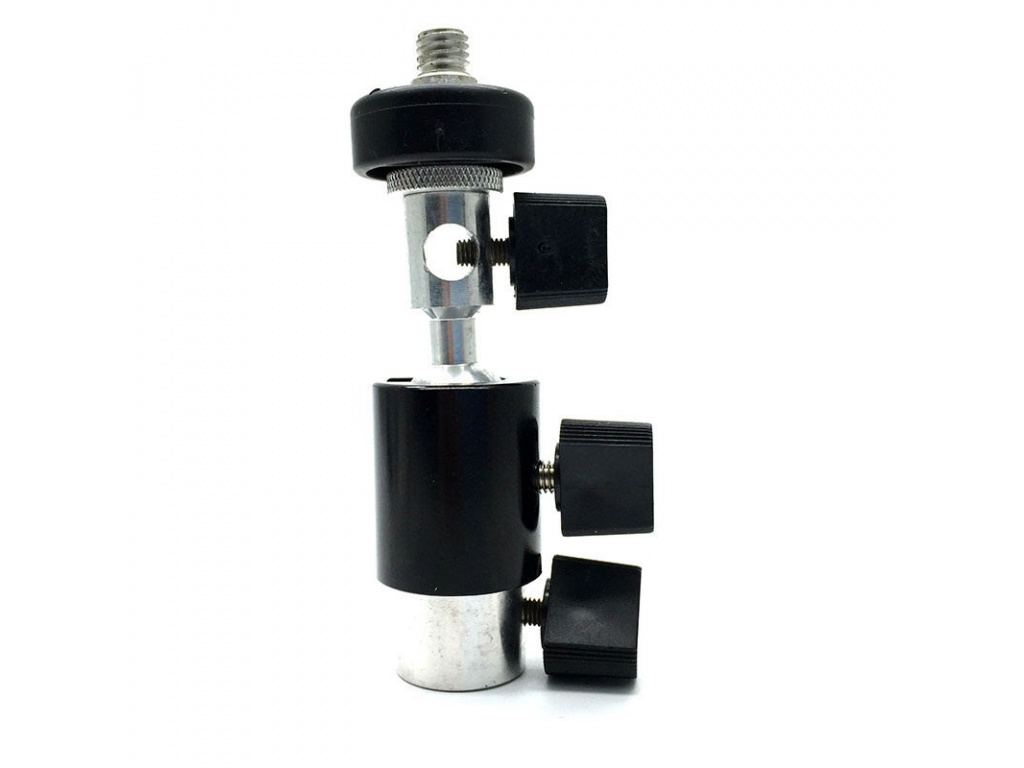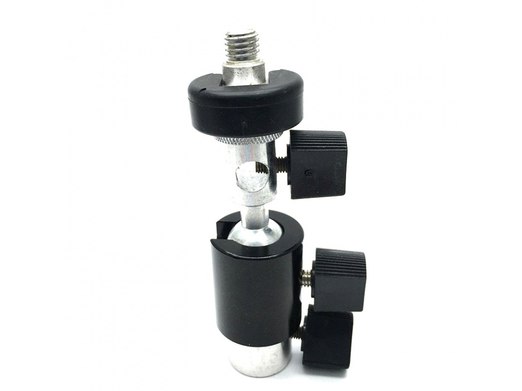 Universeller Blitzhalter mit 360°-Kugelkopf und Schirmbefestigungsloch, für Stative mit Stift. Der obere Teil enthält einen Schlitten zur Befestigung des Blitzes. An der Unterseite befindet sich ein Befestigungsloch für den Schirmstock. Alles wird dann auf einem 360°-Kugelkopf montiert, der nach Bedarf gedreht werden kann. Die gesamte Konstruktion kann dann mit einem Stift an der Schleuse befestigt werden.