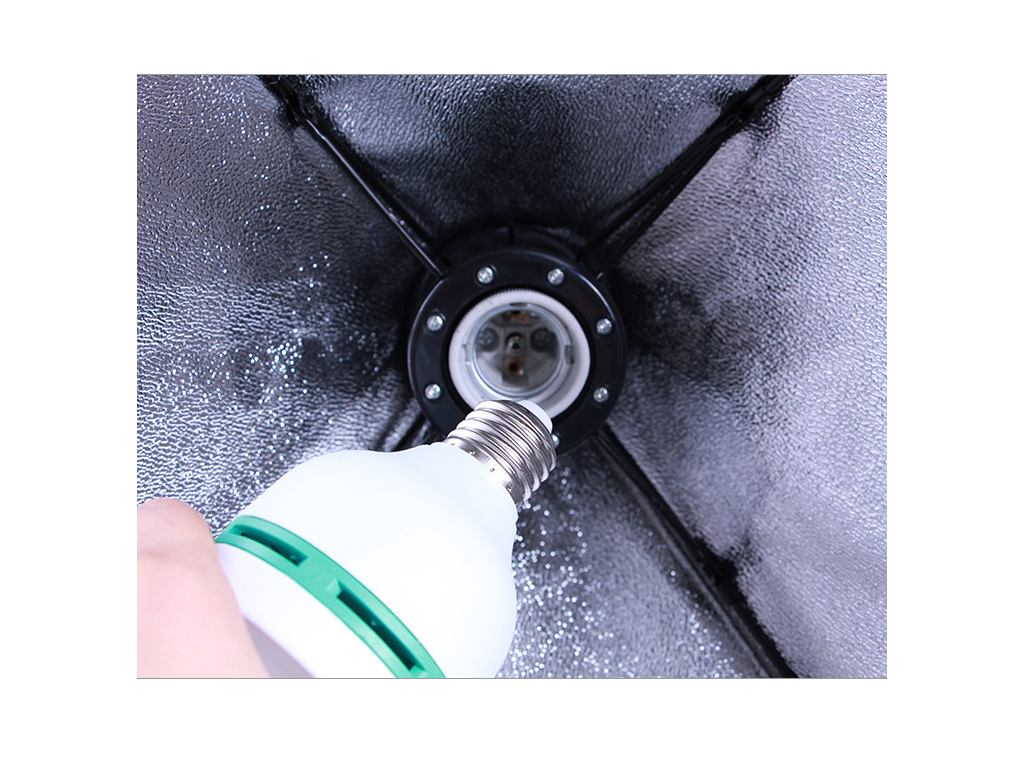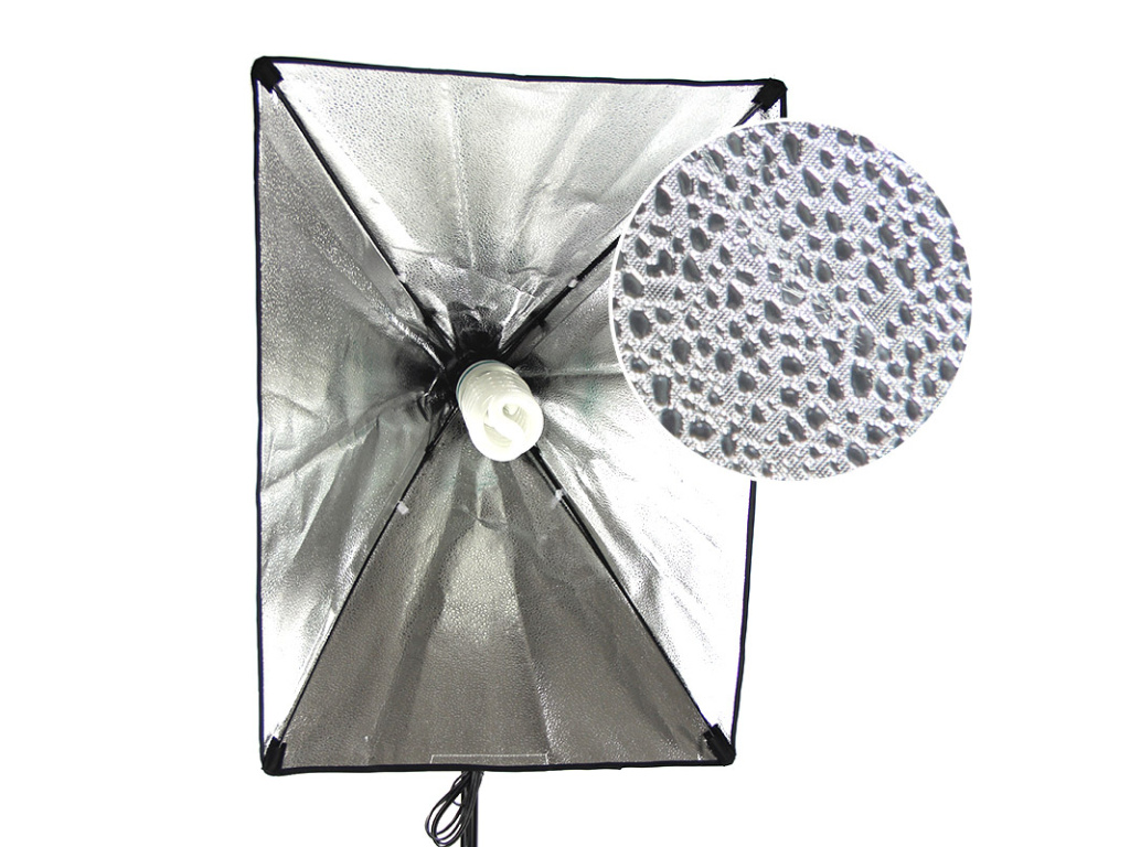 | Die reflektierende Textur bricht das Licht und entfernt gleichmäßig Schatten von Objekten. Die E27-Fassung hält die LED-Lampe fest an ihrem Platz und theoretisch ist diese Fassung mit den Lampen kompatibel, die Sie in Ihrem Haushalt verwenden. Für kreative Zwecke kann auch eine farbige RGB-Lampe mit Fernbedienung in den Softbox geschraubt werden. | Das Lampenstativ mit 1/4"-Schraube hält die meisten Standard-Softboxen sicher. Das Stativ hat eine Länge von 67,8 cm im zusammengeklappten Zustand und die maximale Länge des Stativs beträgt 2 m. | Die Diffusionsschicht mildert das emittierte Licht wunderbar und verteilt es über das gesamte Objekt. Am besten lässt sich die Diffusionsschicht bei der Porträtfotografie kombinieren, wo die natürliche Streuung des Schattens auf dem Gesicht zu sehen ist. Dadurch wird der harte Übergang vom hellen zum schattigen Bereich eliminiert, der Übergang ist weich und natürlich. |