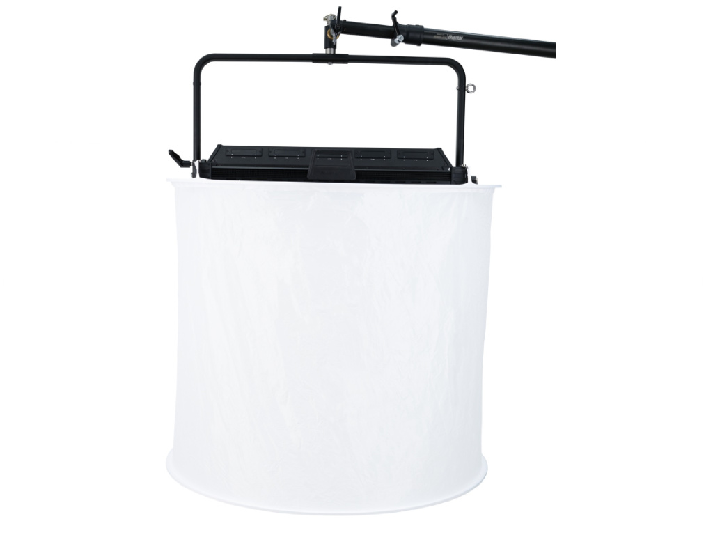 Die Softbox ist eine Raumleuchte, die mit den Dyno 1200C LED-Panel-Lampen kompatibel ist und einen Lichtstrahl in einem Winkel von 300 Grad oder mehr über einen großen Bereich des Raumes verteilt. Es ist so konzipiert, dass es an den Dyno-Lichtern aufgehängt werden kann, wenn es an einem Ausleger montiert ist oder über dem Kopf hängt.