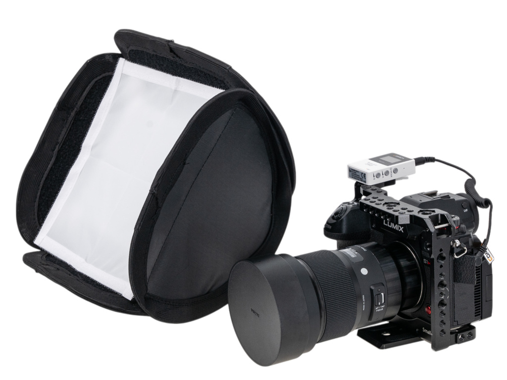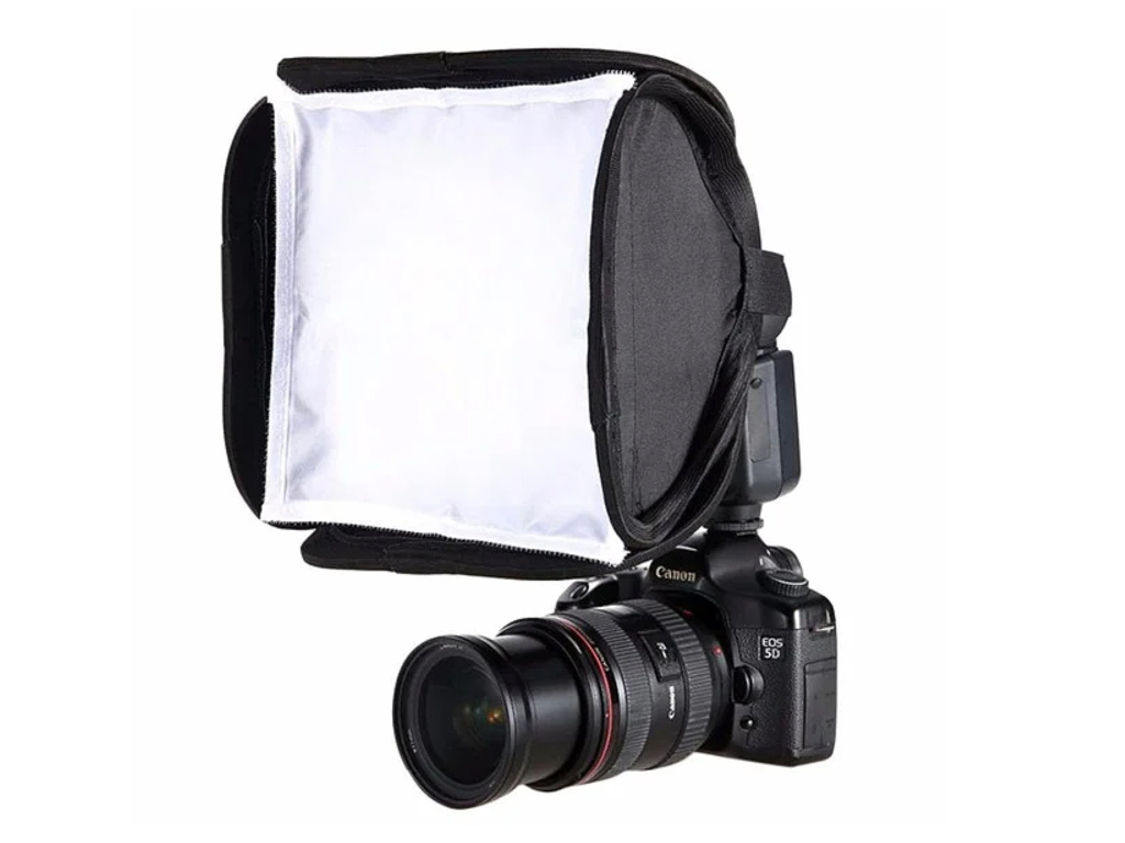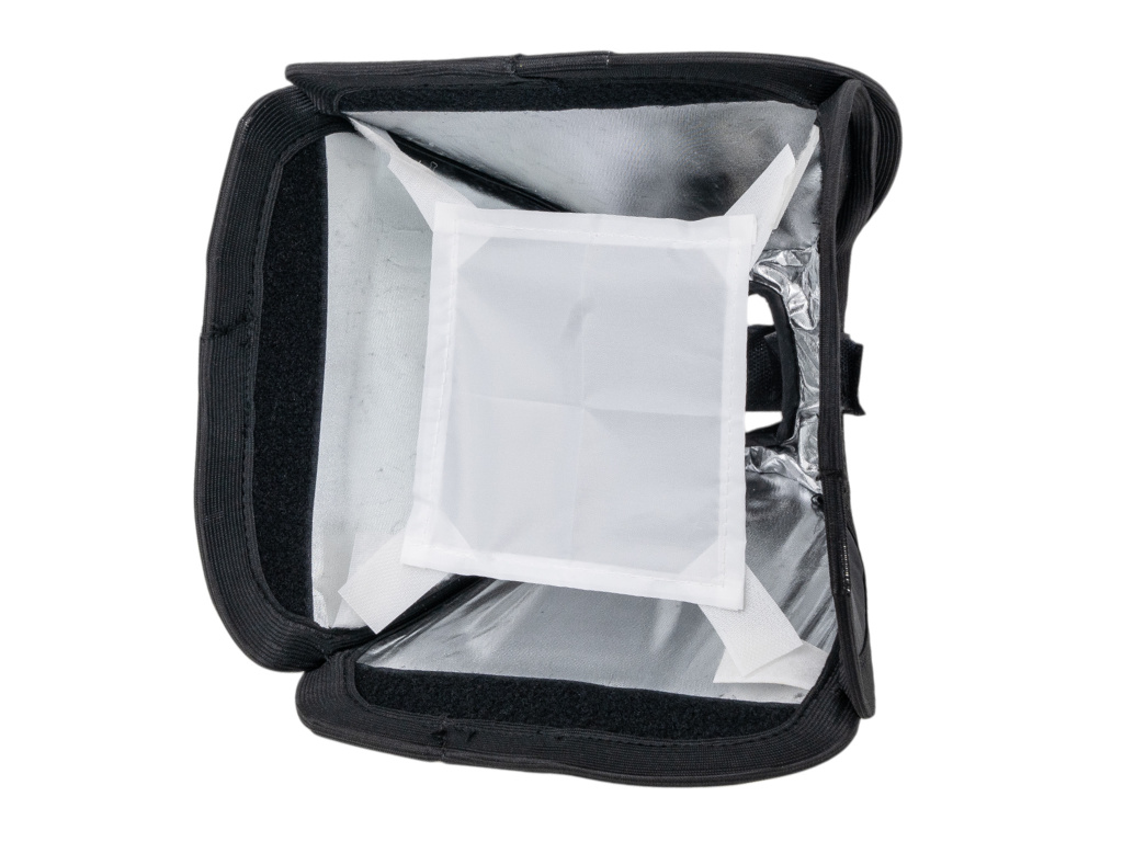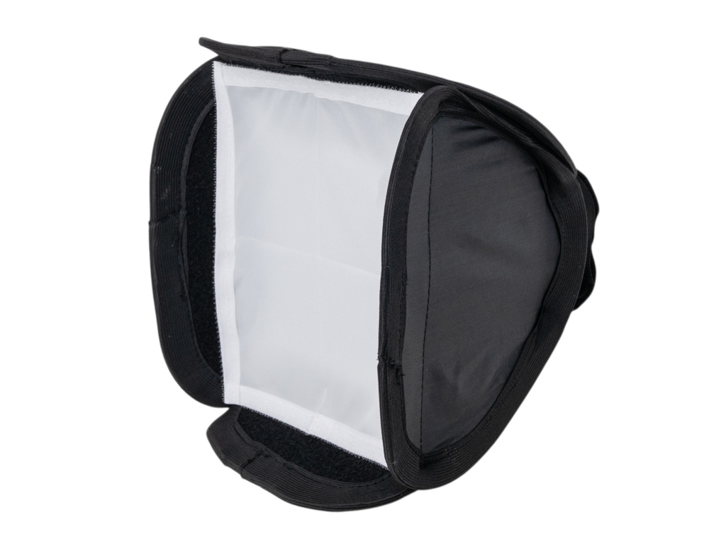 Mini-Softbox 23x23cm, geeignet für Zusatzblitze. Wird direkt am Kamerablitzgerät angebracht. Mildert das Blitzlicht.