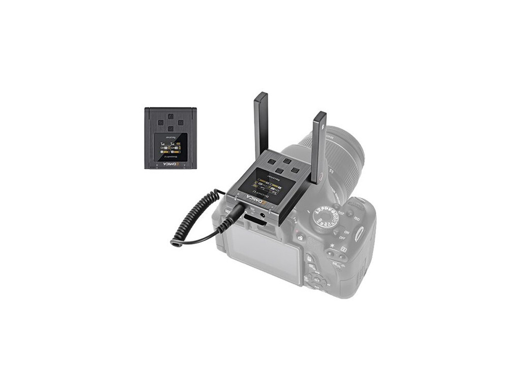 - Der Empfänger ist mit einem Gürtelclip ausgestattet, der gleichzeitig als Schuhhalterung für die Kamera dient.