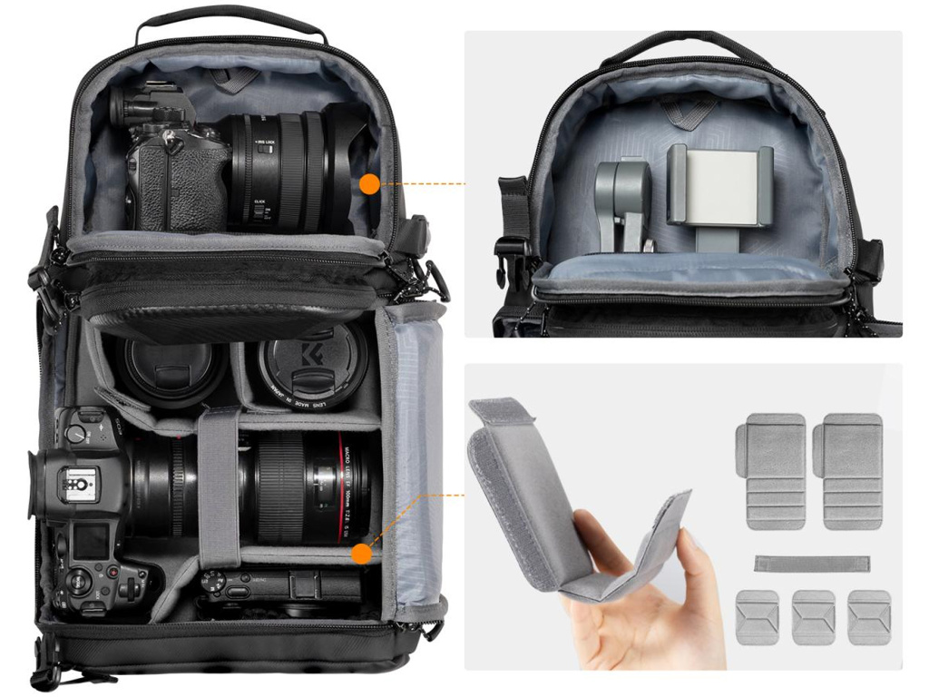 Der KF Concept Urban Wanderer U02 ist ein kompakter 10-Liter-Sling-Bag, der für den sicheren und bequemen Transport von Kameras und Zubehör entwickelt wurde. Das Hauptfach mit modularen Trennwänden bietet Platz für eine DSLR-, spiegellose oder SLR-Kamera sowie weiteres Zubehör, während das obere Fach ideal für kleinere Objektive oder Zubehör geeignet ist. Die robuste EVA-Schale schützt die Ausrüstung vor Stößen, und die seitliche Sicherheitsschnalle verhindert ein versehentliches Herausfallen der Kamera. Zu den praktischen Details gehören eine Seitentasche mit Riemen für ein Stativ oder eine Flasche sowie bequeme, verstellbare Riemen für maximalen Tragekomfort.