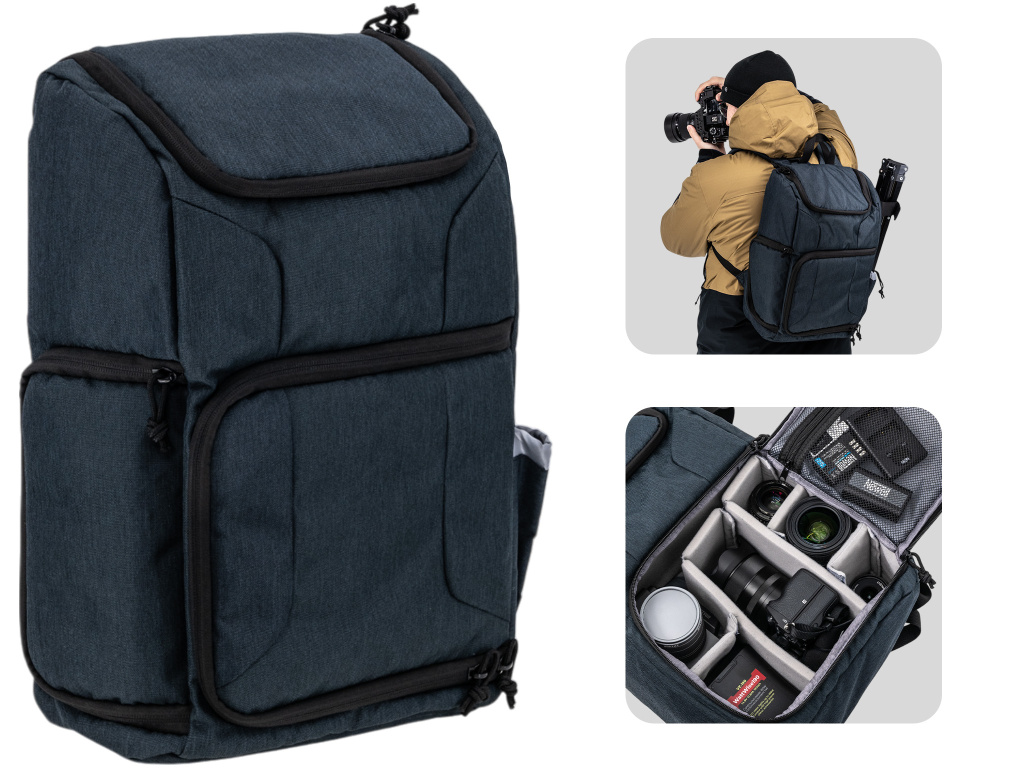 Der Rucksack bietet ausreichend Stauraum für eine Digitalkamera, Objektive, ein Stativ und weiteres Zubehör. Die interne Organisation wird durch drei lange und vier kurze, herausnehmbare Trennwände gewährleistet, die es ermöglichen, den Raum nach Bedarf anzupassen und die Ausrüstung vor Stößen zu schützen. Zwei separate Fächer und ein modularer Inneneinsatz mit Polsterung bieten eine flexible Anordnung für verschiedene Kameras, Objektive, Blitzgeräte oder Drohnen.