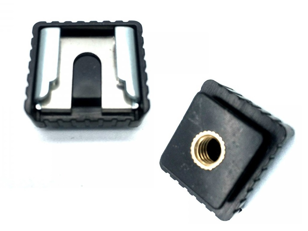 "Blitzschuh"-Adapter mit Standard 1/4"-Gewinde an der Unterseite. Passt zu den meisten Blitzgeräten, Gelenkarmen und anderem Zubehör mit Blitzschuh" (Buchse).