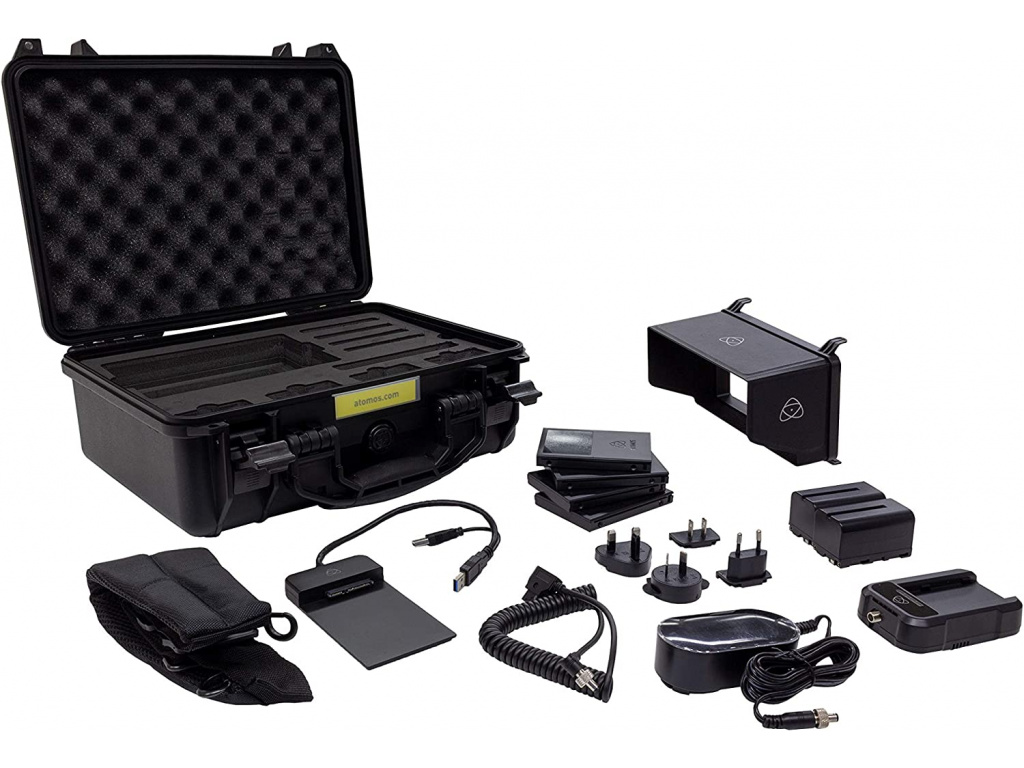 Das Atomos Accessory Kit umfasst zwei 5200mAh-Akkus, ein Schnellladegerät, eine USB-Dockingstation (Kartenleser), ein D-Tap-Stromkabel, ein Netzteil und 4 Master Caddy II SSD-Laufwerksrahmen. Es gibt auch eine Sonnenblende! Alles verpackt in einem eleganten Atomos-Koffer.