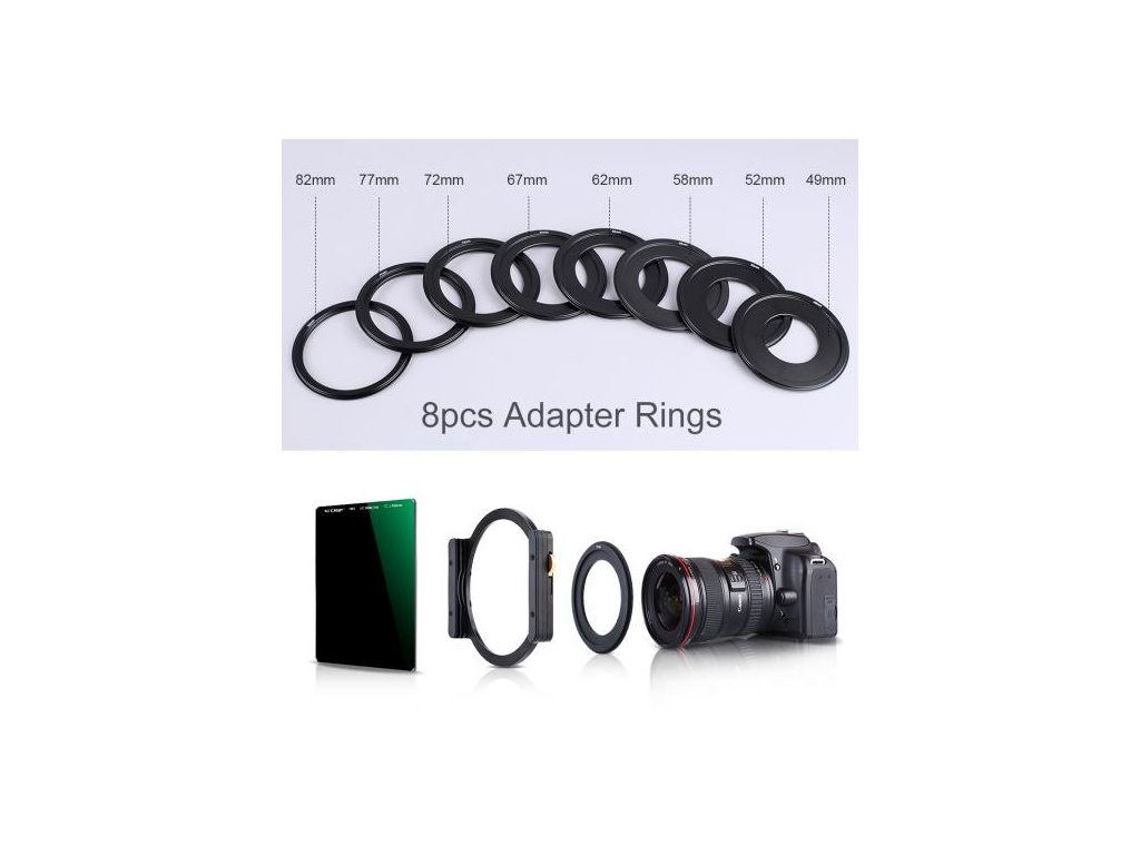 V balení je k dispozici 8 redukčních kroužků, které umožňují nasazení filtru na objektivy s průměry: 49 mm, 52 mm, 58 mm, 62 mm, 67 mm, 72 mm, 77 mm, 82mm.