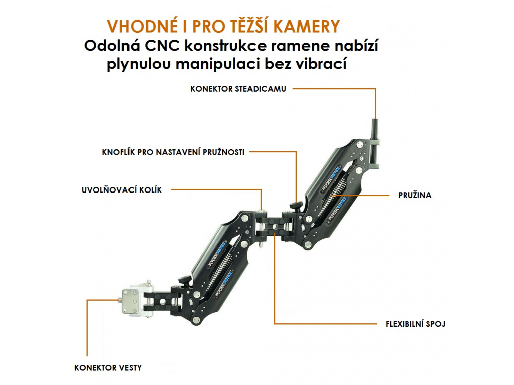 Poměrně lehké, dvousekční VISTA II rameno bylo navrženo pro jakoukoliv váhu do 7kg. 16mm konektor umožňuje nasazení většiny steadicamu od Flycam. Rameno obsahuje dvě ocelové pružiny, u kterých můžete nastavovat pružnost díky chytře umístěným knoflíkům neboli přizpůsobit výšku ramene. Spojení s vestou je realizováno pomocí speciálního konektoru, který můžete lehce přesunout na opačnou stranu.