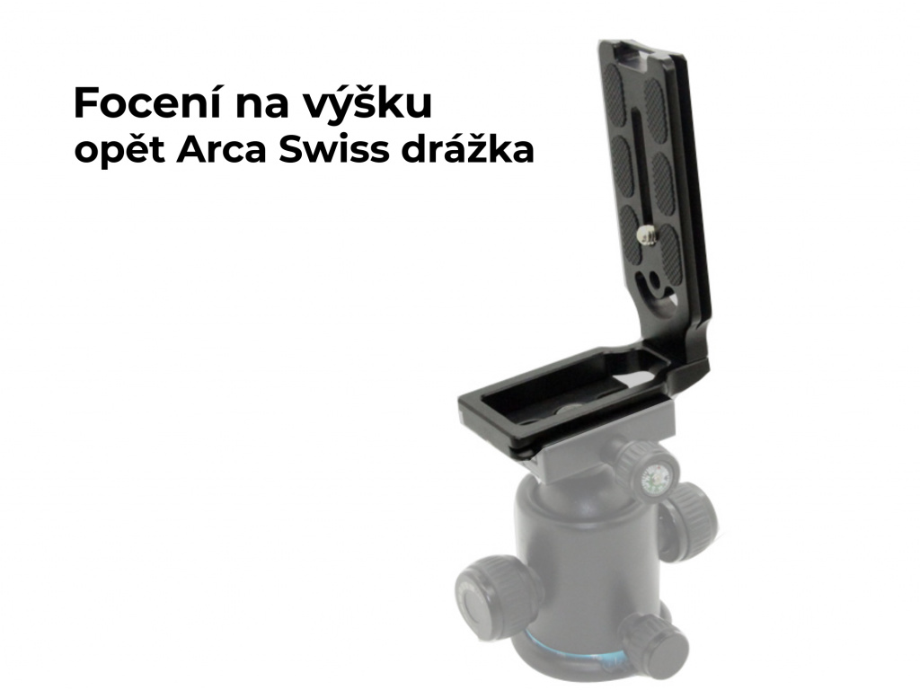 L-klec nebo L-grip s 1/4" šroubem a Arca Swiss drážkou po obou stranách. Ideální pro rychlou změnu focení na výšku, nebo na šířku.