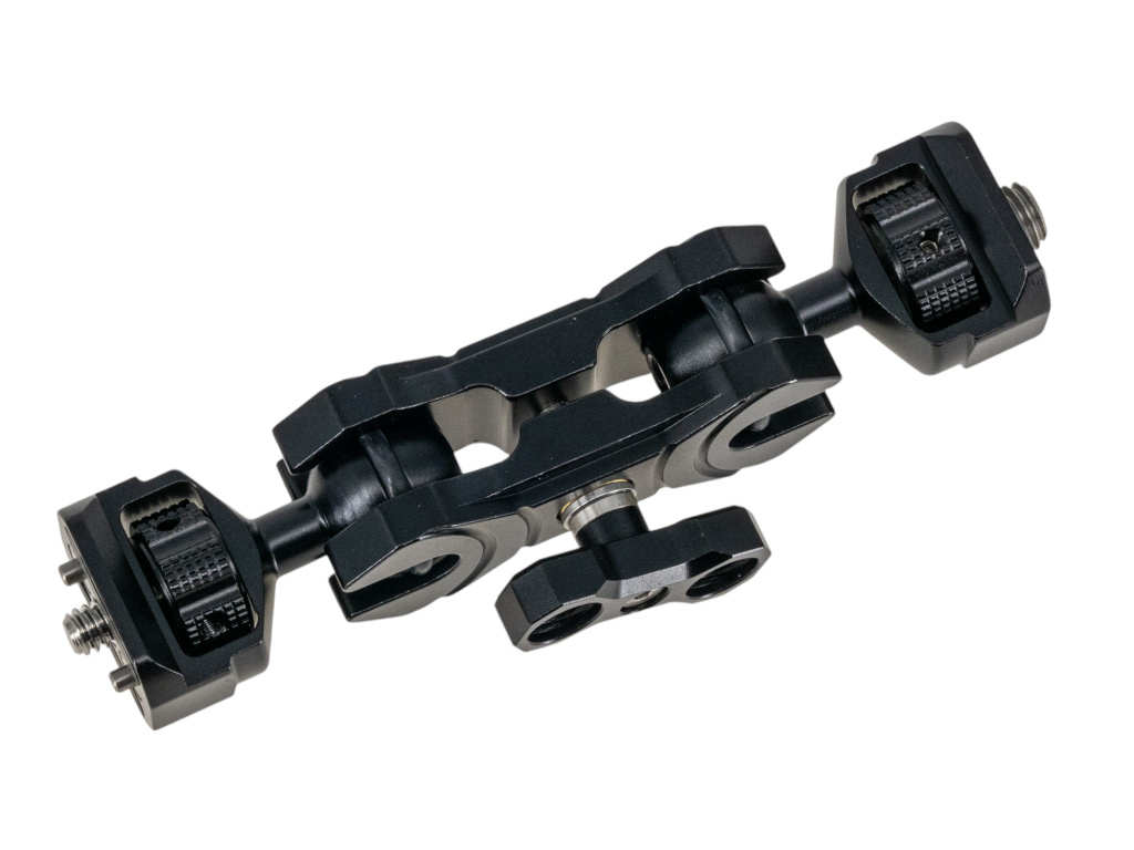 Precizní dvoukloubové rameno pro uchycení náhledových monitorů, power banky, či dalšího příslušenství ve světe fotoaparátů a videokamer. Ideální pro nasazení na kamerové klece, rigy, stativy. Ideální kombinace se svorkou pro uchycení na tyčové tvary. Nosnost kolem 2,5 kg.
