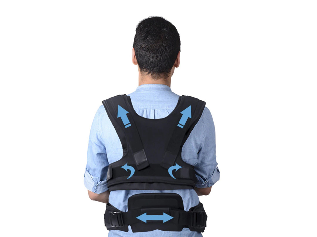 Podpůrná vesta je nastavitelná a tak sedí různým typům uživatelů. Přední část vesty je vyrobena z vysoce kvalitní hliníkové slitiny a díky vycpávkám pohodlně sedí na ramenou.