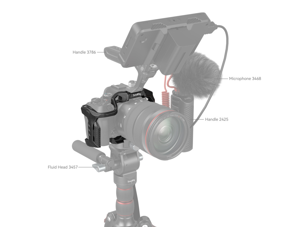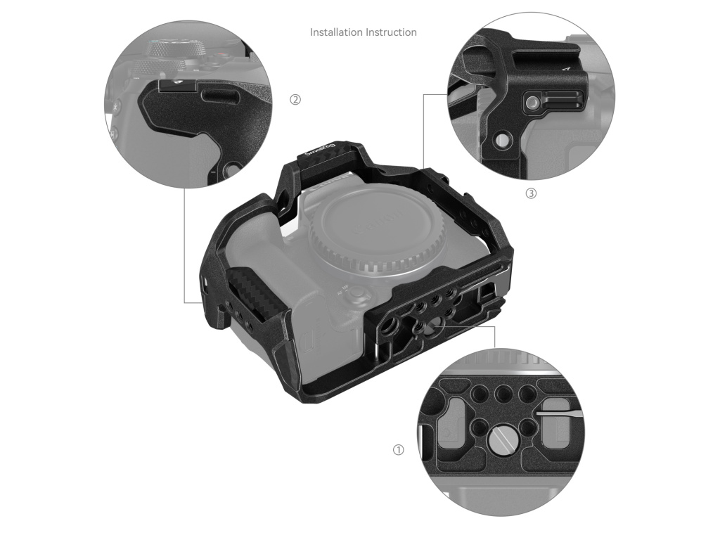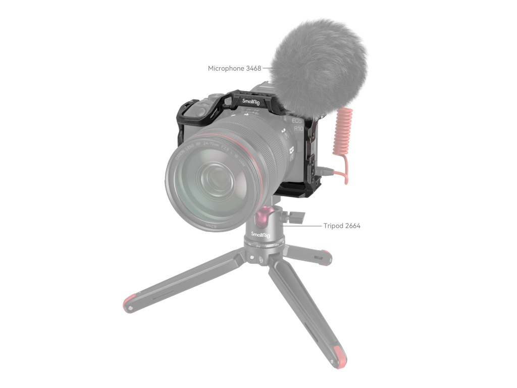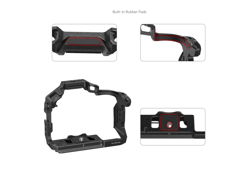 Klec SmallRig „Black Mamba“ pro Canon EOS R10 4004 je navržena tak, aby poskytovala ochranu a několik upevňovacích bodů příslušenství. Zamykání kamery pomocí jednoho 1/4 "-20 šroubu ve spodní části a jednoho bočního uzamykacího adaptéru na obou stranách, tato klec je vybavena silikonovými polštářky, které zabraňují poškrábání, a jako celek ve stylu „Black Mamba“, který poskytuje plný přístup ke všem ovládacím prvkům kamery. Dodává se také s otvory se závitem 1/4"-20 a otvory ARRI 3/8"-16 pro boční rukojeť 2093 a 3814, horní rukojeť 3786 a 3765, magické rameno 2070, držák monitoru 2903; horní a boční vestavěné v úchytech pro uchycení mikrofonu a LED světla; kolejnice NATO pro boční rukojeť 3813; a otvory pro popruhy pro Hand Strap 3848 a popruh pro kameru přes rameno PSC2428. Rychloupínací destička Arca-Swiss ve spodní části podporuje RS 2 / RSC 2 / RS 3 Stabilizátor / RS 3 Pro a stativ Arca-Swiss umožňují rychlé přepínání mezi scénami natáčení z ruky, stabilizátoru a stativu. Vestavěný konektor QD na spodní straně je k dispozici pro připojení systému rychlého odpojení popruhu. Navíc oboustranný součástí je klíč pro snadnou demontáž.