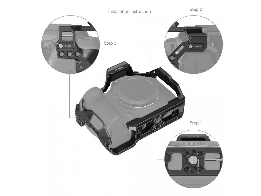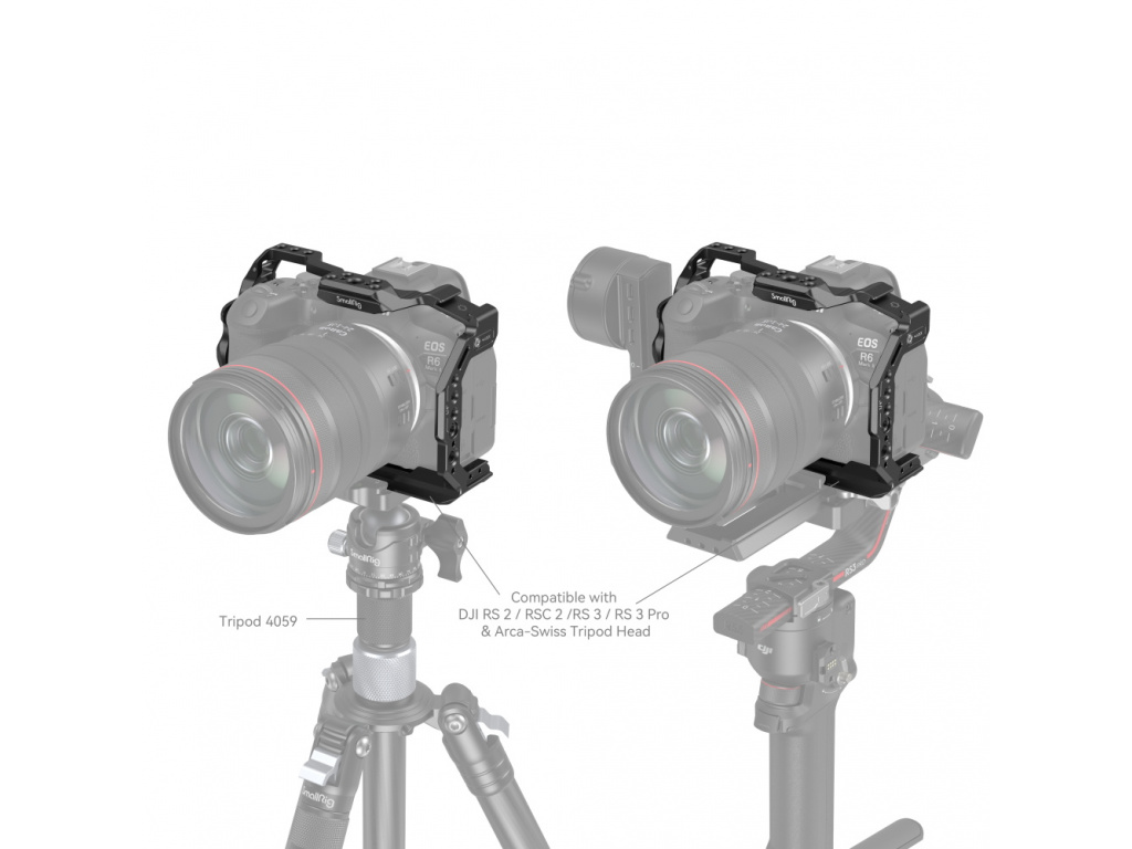 Klec SmallRig pro fotoaparát Canon EOS R6 Mark II 4159 je určena k ochraně a připevnění příslušenství. Uzamkne fotoaparát pomocí jednoho šroubu 1/4"-20 ve spodní části a jednoho bočního zámkového adaptéru na obou stranách, s gumovými podložkami zabraňujícími poškrábání. Klec udržuje přístup k tlačítku fotoaparátu, karetní sraženině, obrazovce a dvířkům baterie a je dodávána s několika držáky příslušenství.