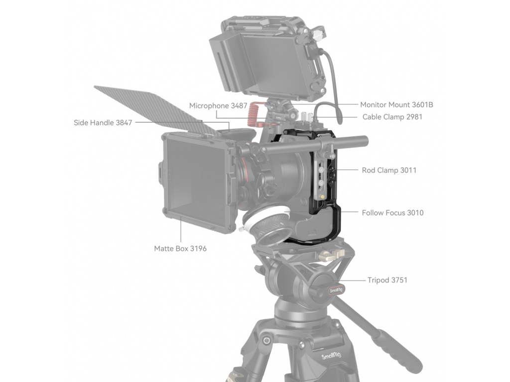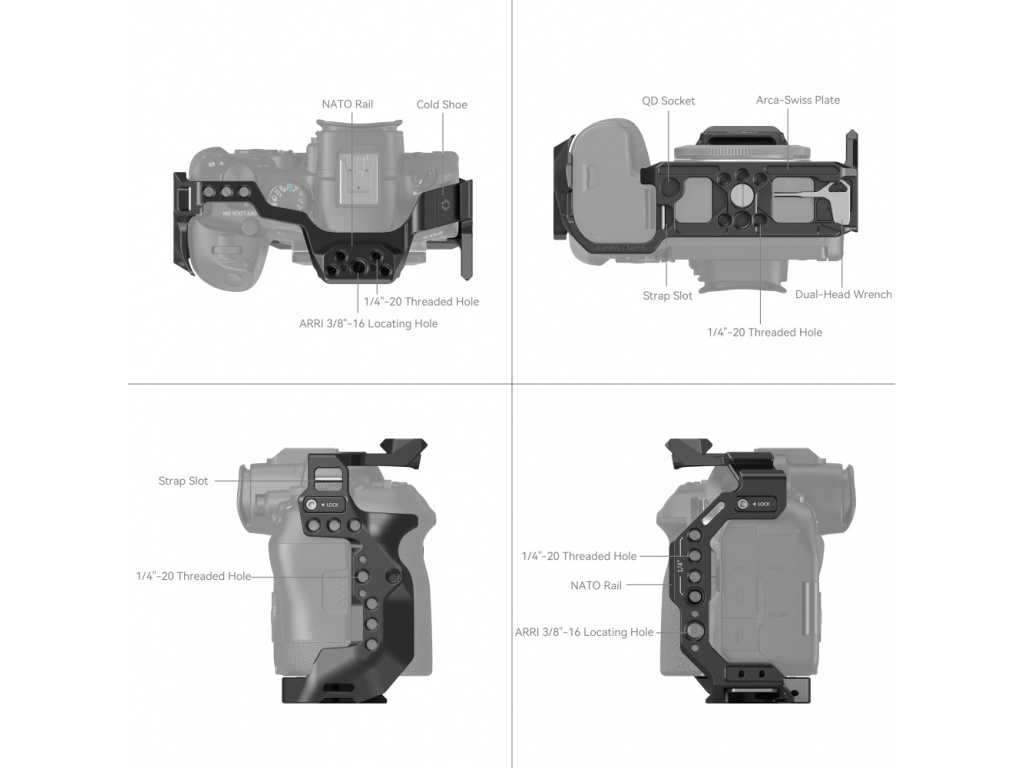 Klec je také vybavena držákem cold shoe pro připojení mikrofonu, LED video světlem atd., otvory pro popruhy pro ruční popruh 3848 a 2456, stejně jako zásuvka QD, kompatibilní se systémem Quick Disconnect pro ramenní popruh. Další předností je rychloupínací deska Arca-Swiss, která podporuje stativy typu Arca nebo stabilizátory DJI RS 2 / RSC 2 / RS 3 / RS 3 Pro pro rychlé přepínání mezi režimem stabilizátoru, kapesního počítače a stativu. Kromě toho je zde klíč s dvojitou hlavou pro snadnou demontáž a montáž.