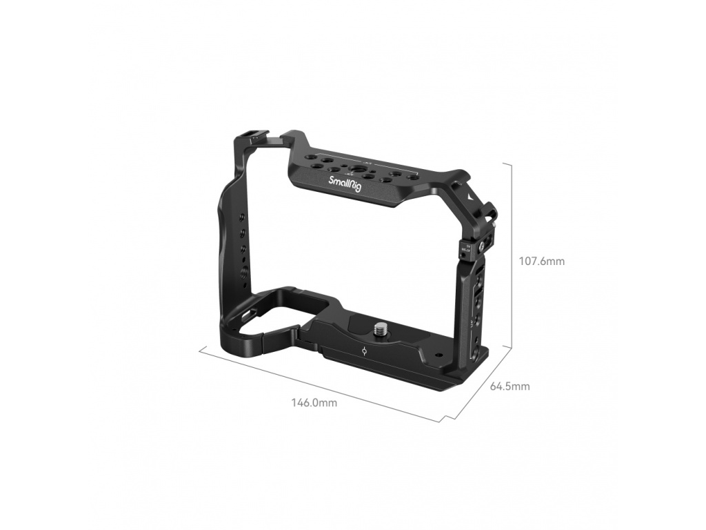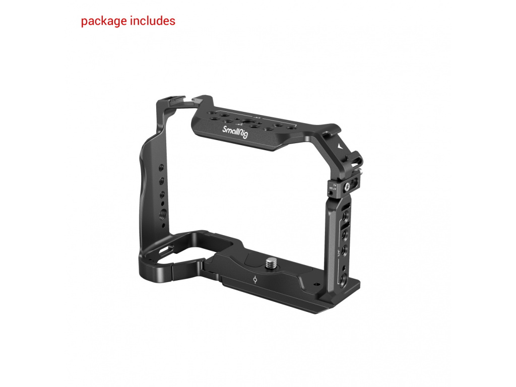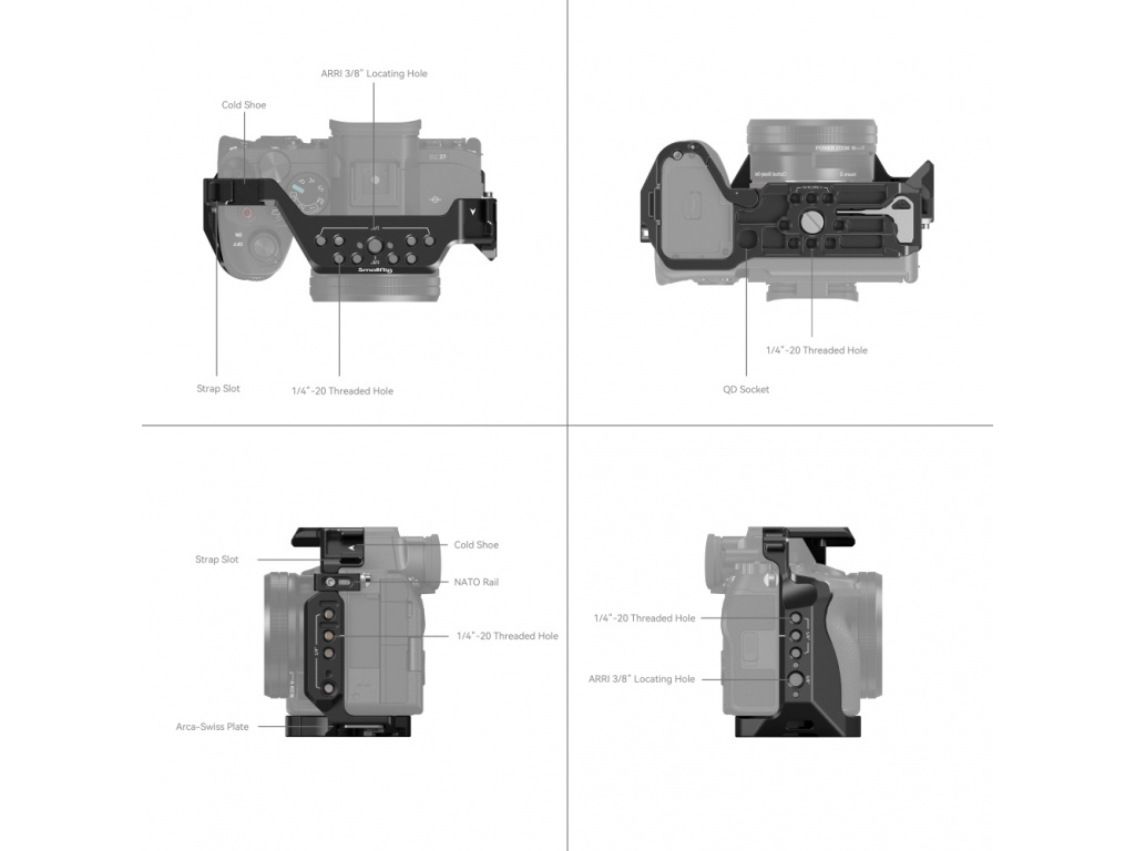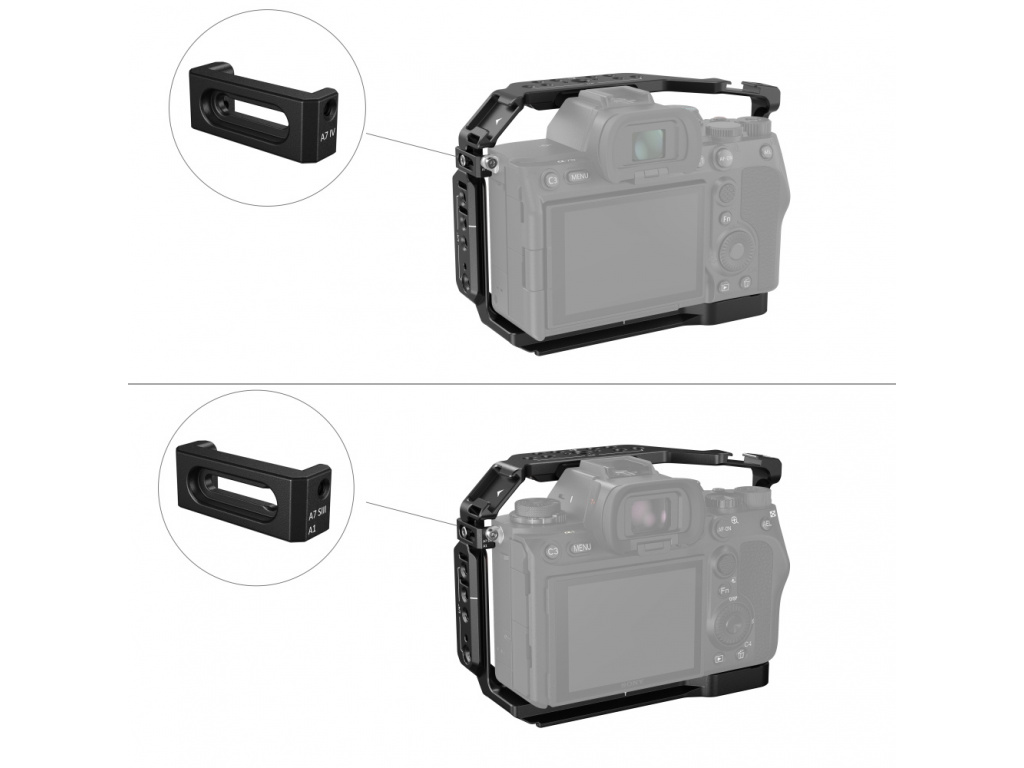 SmallRig Full Cage pro Sony Alpha 7R V / Alpha 7 IV / Alpha 7S III / Alpha 1 / Alpha 7R IV 3667B je navržen tak, aby poskytoval držáky příslušenství a chránil fotoaparát. Uzamkne fotoaparát pomocí jednoho spodního lokalizačního kolíku, jednoho šroubu 1/4 "-20 a jednoho šroubu M2.5 na levé straně. Adaptéry bočního zámku je třeba nastavit směr instalace pro montáž různých typů fotoaparátů, vytištěné s "A7 IV" je pro Alpha 7 IV a Alpha 7R V, zatímco vytištěno s "A7S III / A1"je pro Alpha 7S III / Alpha 1 / Alpha 7R IV. Vestavěné všestranné ochranné distanční prvky zabraňují poškrábání fotoaparátu. Klec umožňuje přístup k rozhraním, voličům, tlačítkům nebo dvířkům baterie. V prostoru pro baterie je klíč na vřeteno, který se vejde do křivky fotoaparátu a ponechává prostor pro malíček pro pohodlné uchopení. 1/4 "-20 závitové otvory, ARRI 3/8 "-16 axiální otvory a držáky cold shoe podporují horní rukojeť, držák monitoru, mikrofony, LED světla, monitory atd.
