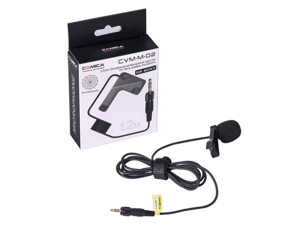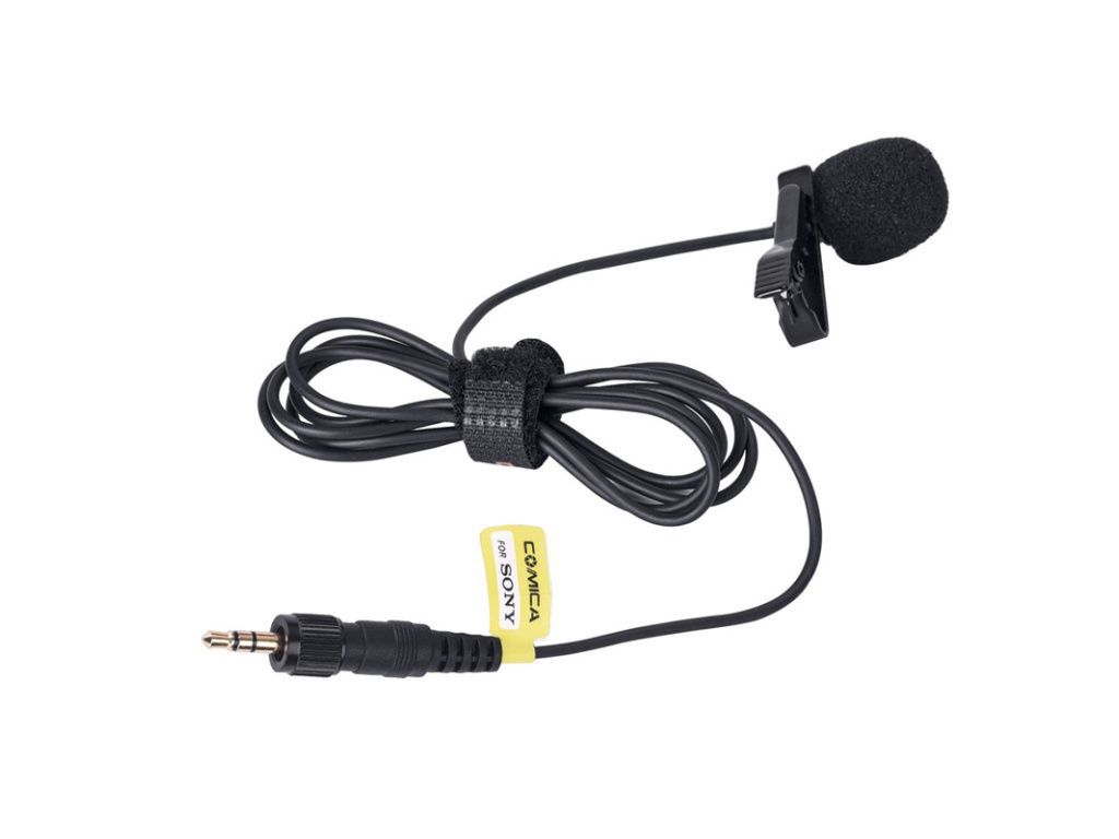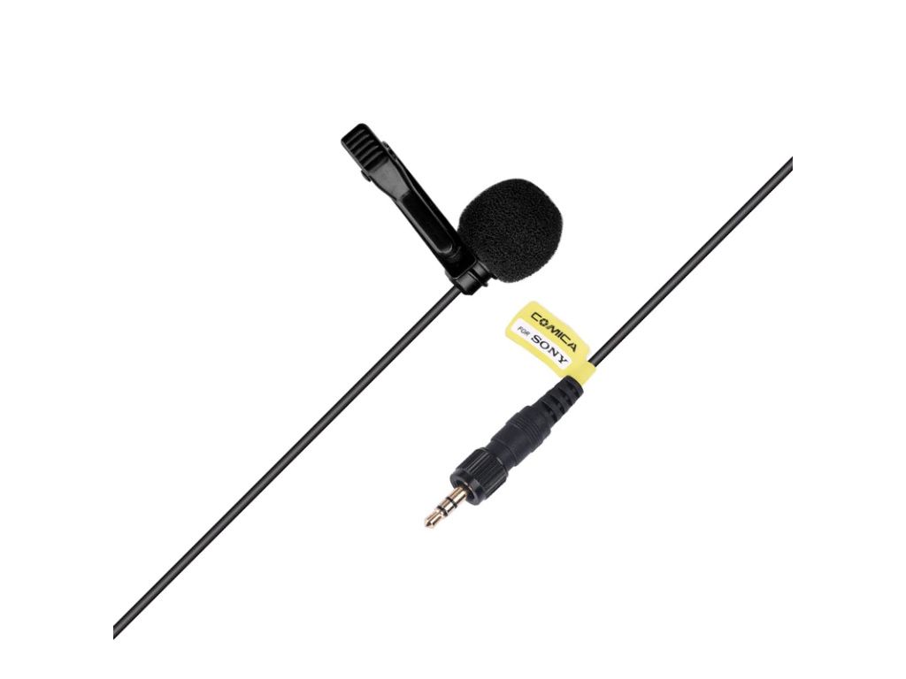 Comica Audio všesměrový klopový mikrofon 3,5 mm audio jack se Sony aretací. Délka kabelu je pouze 1,2 metrů, takže je ideální pro bezdrátové vysílače ze systému mikroportů Sony.