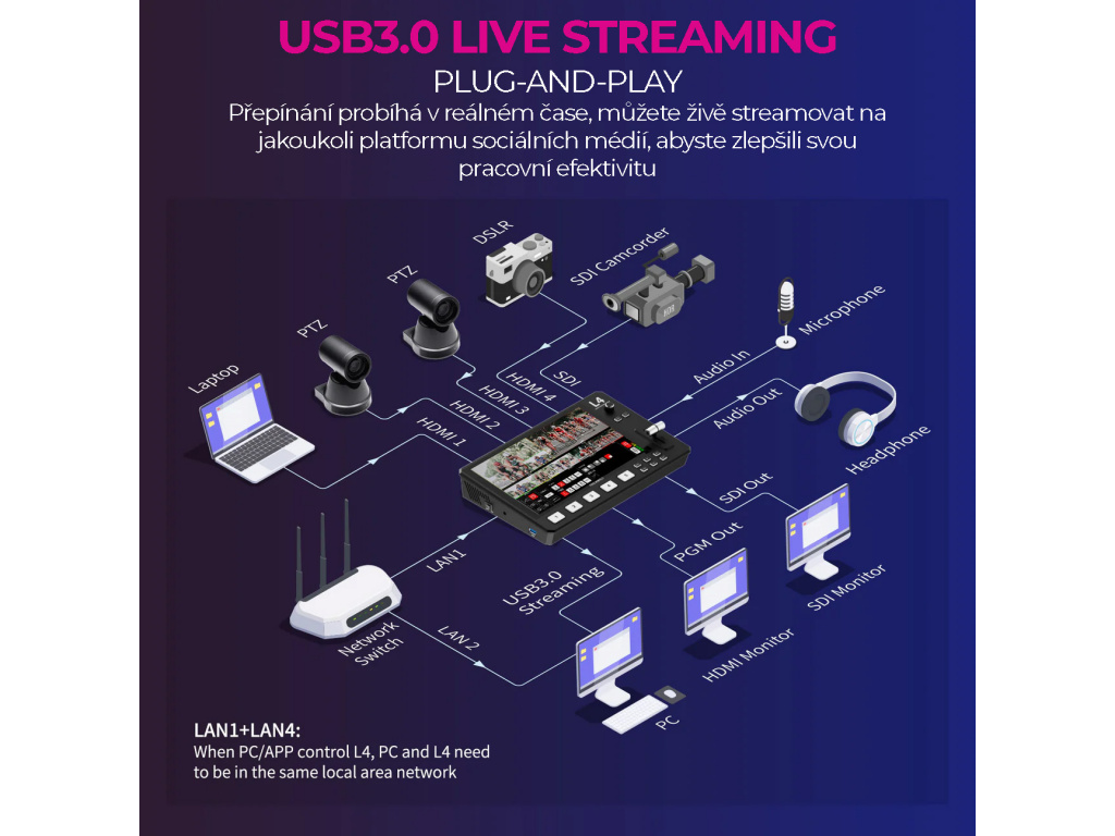 L4 je vybaven připojením USB 3.0, které funguje jako jednoduchý zdroj webkamery. Může se připojit k jakémukoli počítači, takže veškerý software pro streamování na sociálních médiích funguje! Například software OBS pro živé vysílání nebo konferenční software (Skype, ZOOM, Tencent conference a Yealink) pro obchodní prezentace. Všechny přepínání probíhají v reálném čase, takže můžete živě vysílat na jakoukoli sociální platformu, jako je YouTube, Facebook, TikTok, Douyu TV a mnoho dalších!