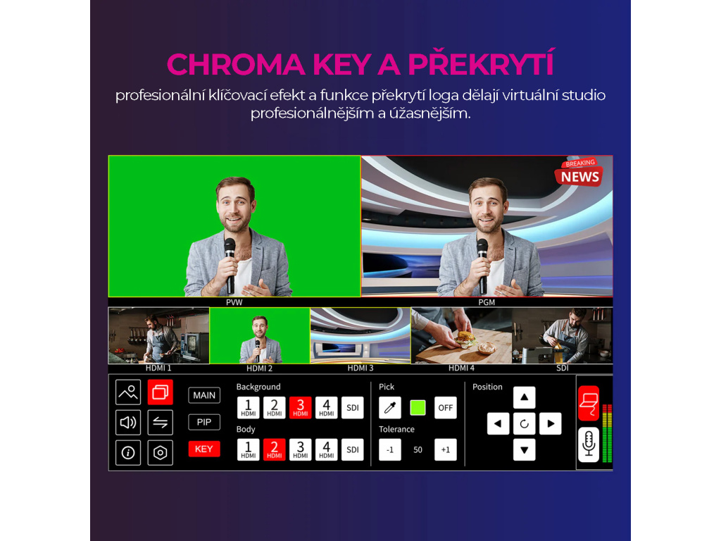 Poznámka: 1. Chroma Key se dosáhne výběrem požadovaného signálového zdroje jako těla a pozadí, barva se snadno získá kliknutím na libovolnou pozici zdroje těla.