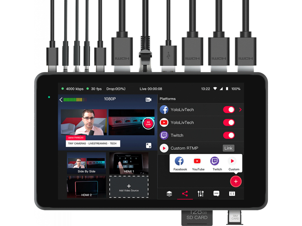 Je vybaven 3 HDMI vstupy, 1 HDMI výstupem, 1 plně vybaveným USB-C portem, který umožňuje přepínat až 8 zdrojů a až 4 fyzické lokální kamery. Další dvě předem nahraná videa jsou uložena na interním paměťovém čipu nebo spouštěna z webového zdroje. YoloBox Pro podporuje vstupní rozlišení 720p a 1080i/p, stejně jako streamy 540p, 720p a 1080p60 podle vašeho výběru, pomocí kodeku H.264. Díky HDMI výstupu můžete váš stream zobrazit lokálně také na HDMI zařízení.