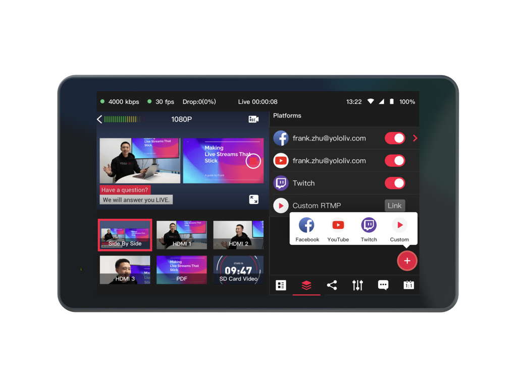 YoloBox Pro je video přepínač, kodér, monitor, rekordér a audio mixer v jednom. Díky vestavěné službě restreaming se nativní podpora integruje přímo s YouTube, Facebook a Twitch. Můžete se jednoduše přihlásit ke svému účtu na sociálních sítích a začít streamovat. V nabídce můžete přidat grafické prvky, jako jsou loga, obraz v obraze, výsledkovou tabulku a rolovací titulky, také komentáře ke streamu, zobrazení vedle sebe, rozdělené zobrazení a mnoho dalšího. Můžete snadno komunikovat se svým publikem v reálném čase díky překrývání komentářů a přizpůsobeným možnostem obrazu v obraze, včetně režimu rozhovoru, upravitelných vestavěných šablon a možnosti nahrát vlastní šablony, čímž přizpůsobíte a vnesete do vašeho streamu vaše vlastní nápady a osobnost.