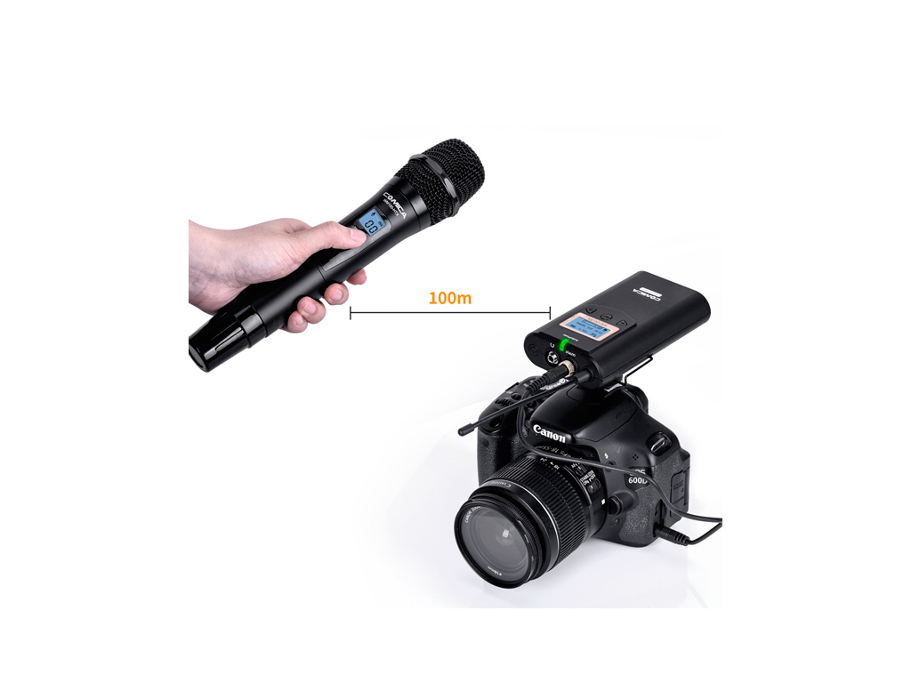 Comica Audio CVM-100HTX je bezdrátový ruční mikrofon pro systémy mikroportů WM100. Provoz až v 48 kanálech spolu s dalším audio zařízení. Vysílací frekvence: 520.000MHz ~ 534.100MHz. Pracovní dosah až 100 m v otevřeném prostranství a 70 m v prostředí s překážkami. Nechybí ani low cut filtr pro práci ve velice rušném prostředí. Status mikrofonů, aktuální kanál, provozní skupinu a výdrž baterie můžete sledovat pomocí jasného LCD displeje.