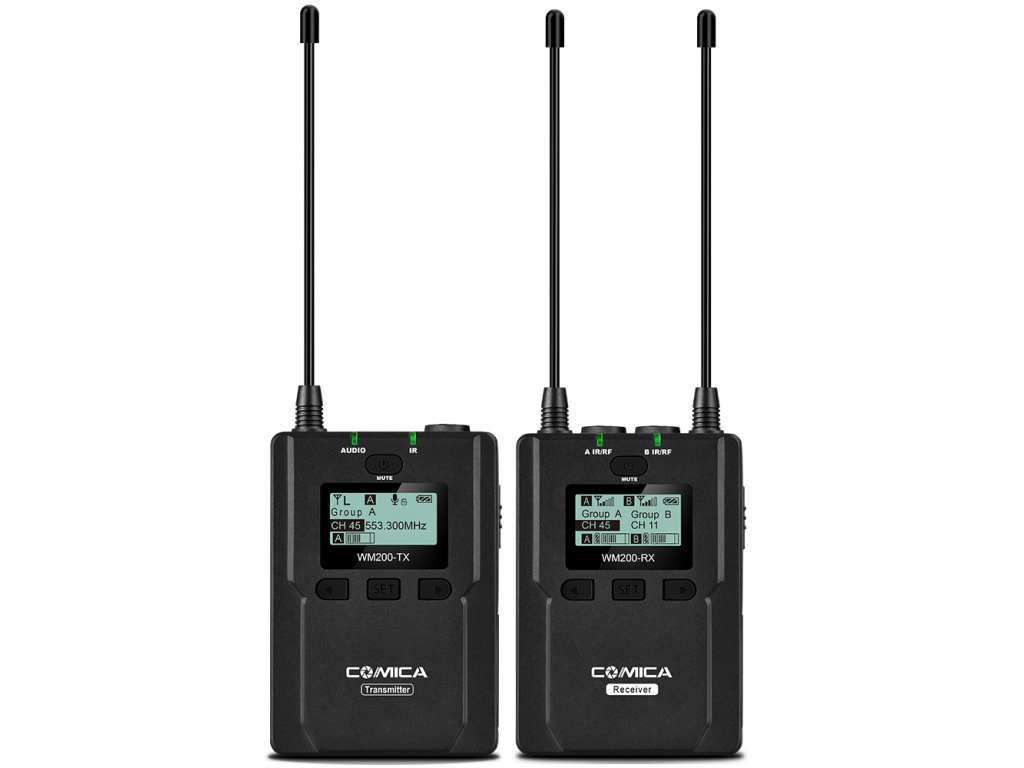 Universální bezdrátový audio systém Comica Audio CVM-WM200A využívá technologii UHF, která umožňuje provoz až ve 96 kanálech. Mikrofon se dvěma vysílači a jedním přijímačem.