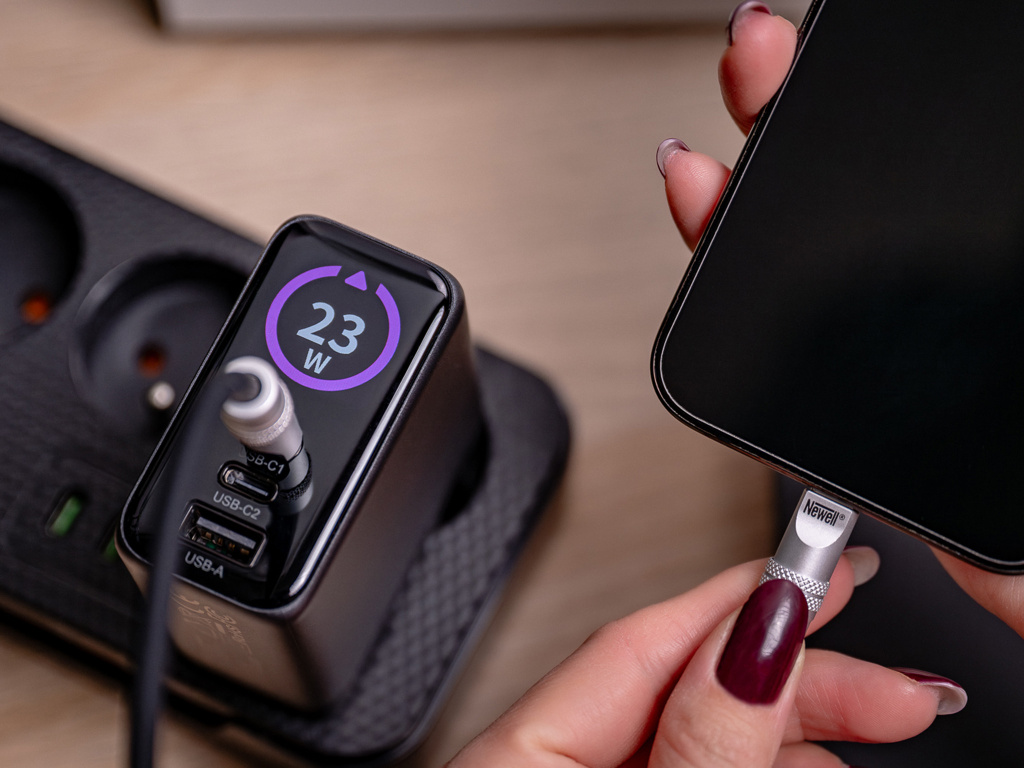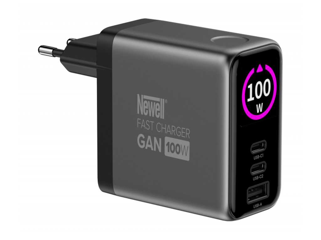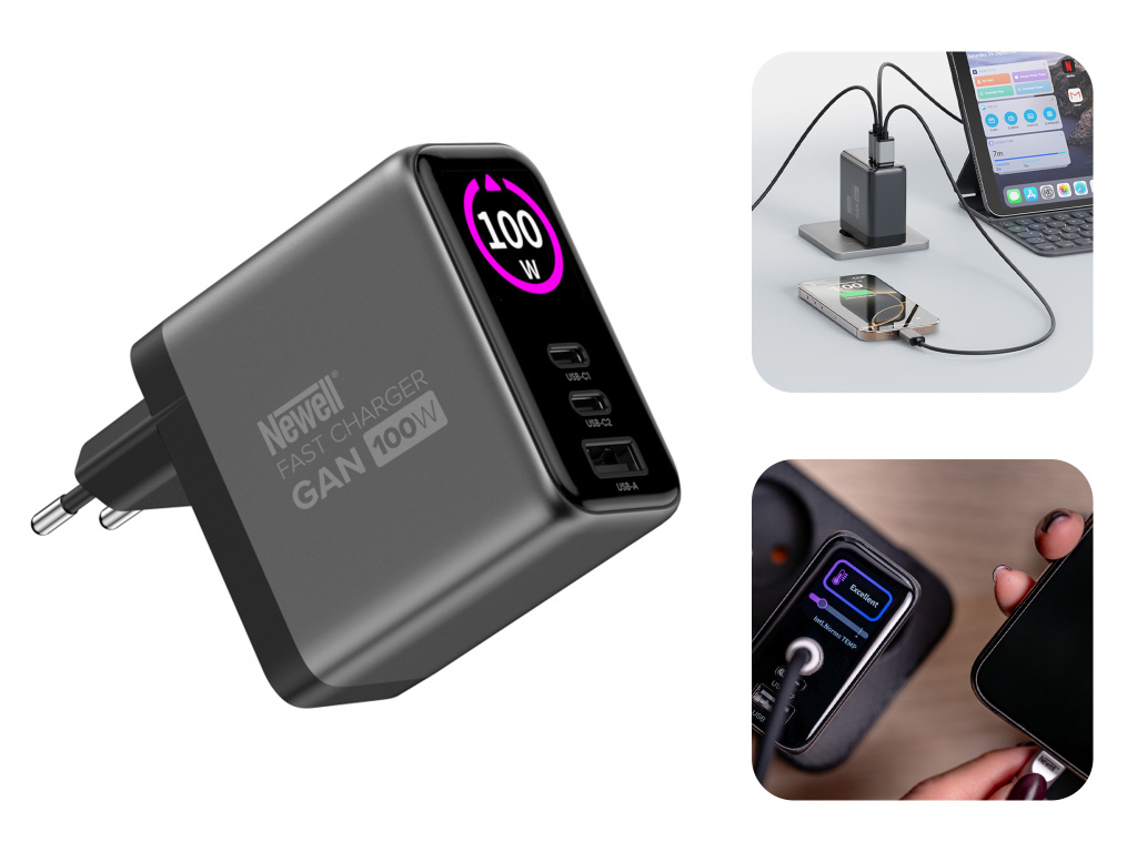 Multifunkční síťová nabíječka Newell GaN 100 W TFT – EU vám ušetří spoustu místa a času. Díky 2 portům USB-C a jedné zásuvce USB-A můžete nabíjet až tři různá zařízení současně. Ať už připojíte notebook, smartphone a sluchátka nebo tablet a powerbanku, nabíječka automaticky upraví výkon tak, aby každé zařízení dostalo optimální dávku energie.