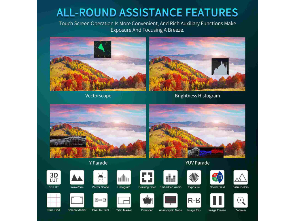 Monitor je vybaven 3 standardními 1/4” montážními závity (dole, vpravo, vlevo), můžete jej snadno připevnit na kameru nebo jiné typy zařízení pomocí magického ramene, držáku atd. Splňuje různé požadavky na monitorování pro fotografa nebo režiséra.