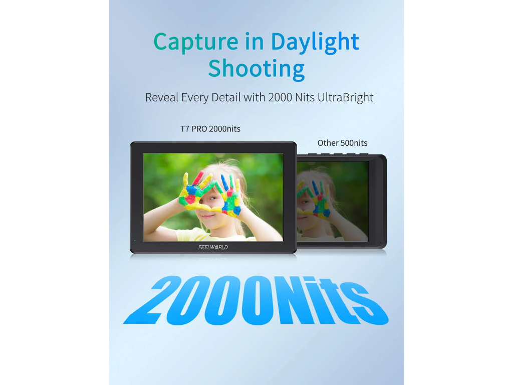 FEELWORLD T7 PRO je 7" profesionální monitor navržený pro filmaře, tvůrce videí a živé produkce, kteří vyžadují maximální jas, přesnost obrazu a odolnost v terénu. Ultra jas 2000 nitů zajišťuje perfektní viditelnost i na přímém slunci, zatímco Full HD IPS panel poskytuje věrné barvy, široké pozorovací úhly a detailní náhled.