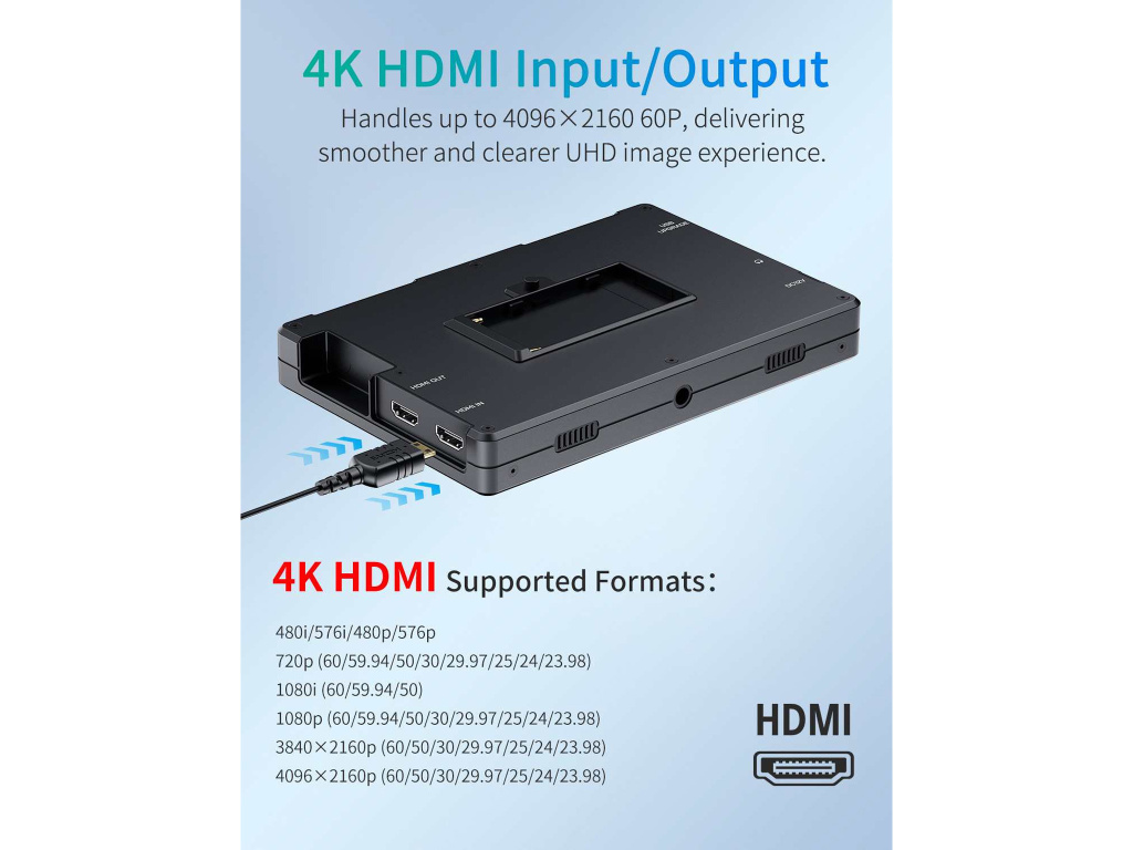 Odolné hliníkové pouzdro zaručuje lepší odvod tepla a dlouhodobě stabilní výkon v režimu vysokého jasu. Monitor je vybaven 4K HDMI vstupem i výstupem (až 4096×2160/60p), nechybí ani 3,5mm výstup pro sluchátka a flexibilní napájení pomocí DC nebo baterií NP-F.