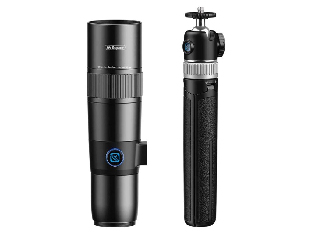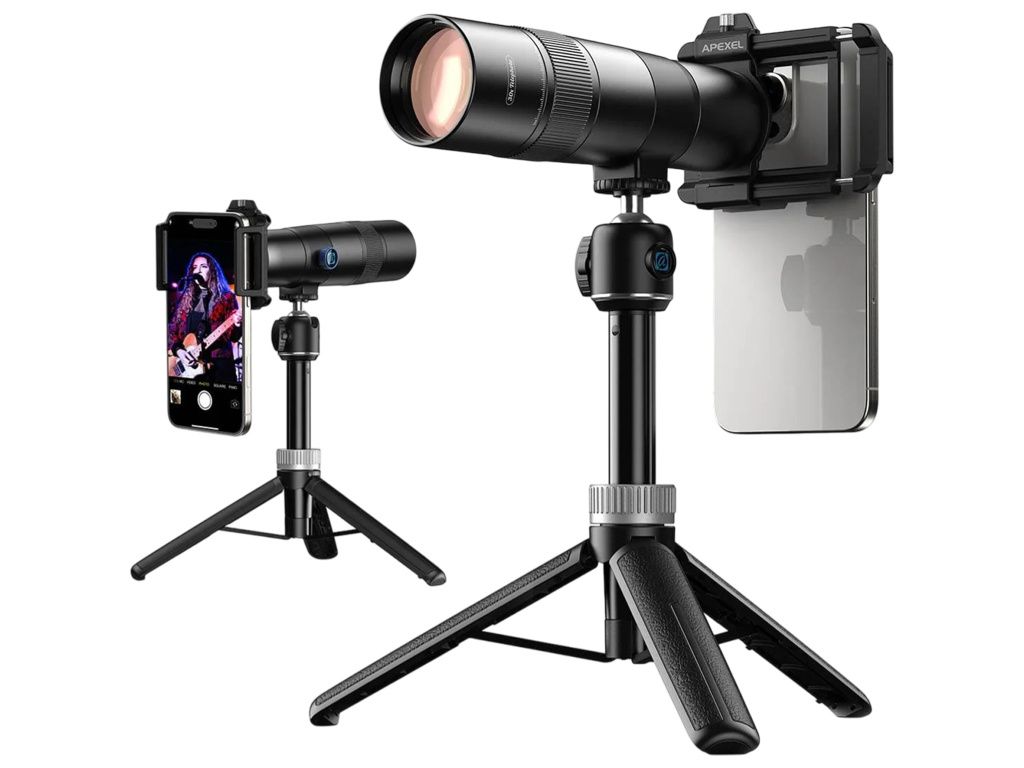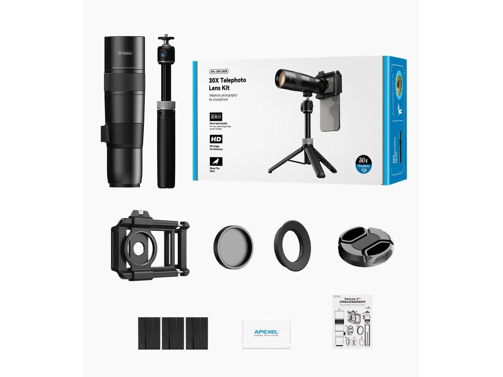 Apexel TeleCular 30× teleobjektiv se stativem pro smartphone nabízí optické 30× přiblížení a ohnisko 720 mm pro fotografování krajiny, architektury i divoké přírody. Vícevrstvá optika zajišťuje ostrý obraz s minimálním zkreslením. Součástí je držák telefonu a stativ pro stabilní snímky.