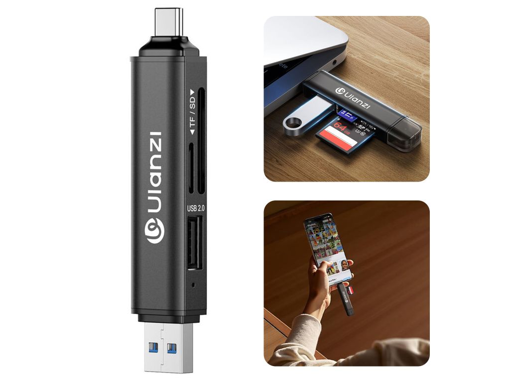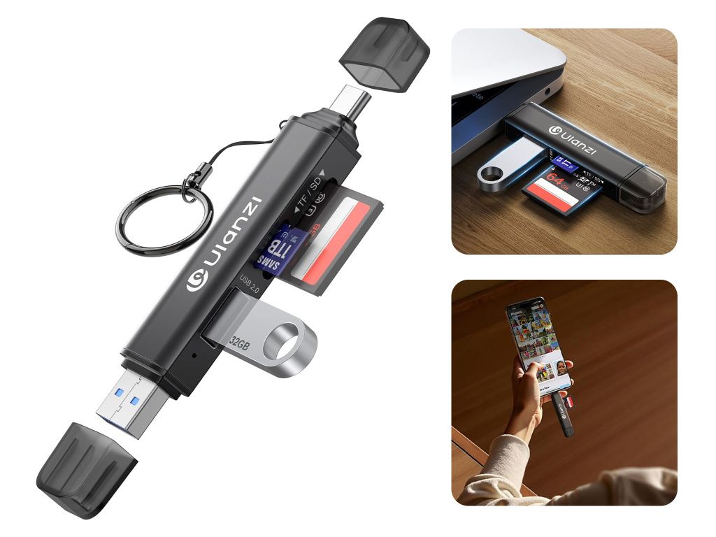 Čtečka paměťových karet je vybavena konektory USB-A i USB-C, takže ji snadno připojíte k počítačům, televizím, herním konzolím i moderním mobilním zařízením. Jedno kompaktní zařízení tak pokryje většinu běžných zařízení, která používáte doma i na cestách.